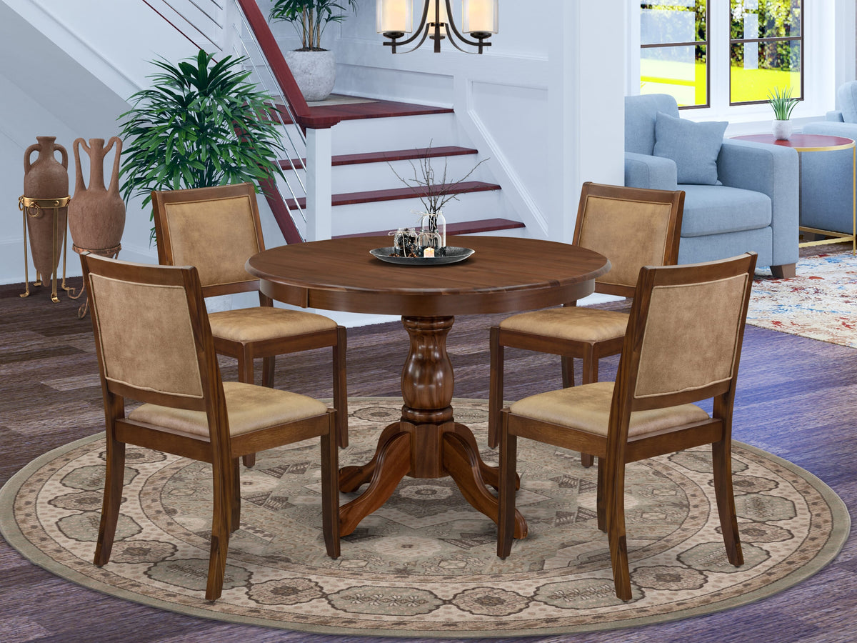 We are pleased to introduce our exquisite 5-piece Dining Table Set, featuring a meticulously crafted dining table accompanied by 4 stackable dining chairs. This sophisticated ensemble exudes elegance, making it an ideal choice for intimate gatherings with friends and family. Designed with modern sensibilities, it seamlessly complements any interior décor, adding both versatility and charm to your space. The dining table boasts a captivating Antique Walnut tabletop supported by pedestal legs, perfectly complemented by the chic dining chairs adorned with Brown Textured Faux Leather seats and an Antique Walnut finish. Crafted with precision using robust Rubberwood for the table and resilient Acacia wood for the chairs, this set ensures durability and enduring quality. Our plush dining chairs offer luxurious seating, upholstered in premium Faux Leather for long-lasting comfort. Enhanced with high-resilience foam padding, these chairs guarantee a delightful dining experience for you and your guests on every occasion.