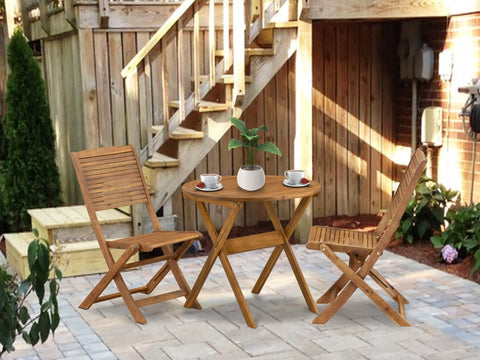 Looking for the perfect patio dining set for your small outdoor gatherings? Look no further than this patio dining set includes a round patio coffee table with two side chairs. The set is designed to be both stylish and functional, with a folding feature of the chairs makes it easy to store when not in use. Whether you have a backyard, balcony, or porch, this patio dining set will complement any outdoor area. With its natural oil finish, the set creates an inviting, smooth, lustrous seating arrangement that will enhance any outdoor decor style. Plus, the environmentally friendly finish makes it a great choice for eco-conscious shoppers. Constructed from durable Acacia wood, this patio dining set is built to withstand various weather conditions and last for years to come. Another Key feature of this outdoor patio dining sets is that it is easy to maintain. Restaining the furniture once a year can help to keep it looking brand new and extend its lifespan. The rustic design adds charm to any outdoor space, while the burr-free finish ensures a comfortable dining experience. Assembly is a breeze thanks to the easy-to-follow instructions included in the package. No additional tools are required, so you can have your new outdoor patio dining sets set up and ready to use in no time. Enjoy the warm weather with family and friends while soaking up the beauty of the great outdoors with this high-quality patio garden table set.