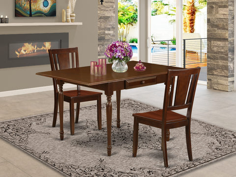 Upgrade your current dinette room with this simple yet functional MZDU3-661-1 kitchen and dining room table set. Designed in the transitional style for your casual dining place, the kitchen set will be a pleasant area for your loved ones to gather during meals and social activities. The convenient 3 pieces dining table set for 2 contains a dining table and two dining chairs. Crafted from Asian tropical hardwood also known as rubberwood, the dinette table has smooth edges and designed round legs for a fancy style. The dining room table integrates two 9-inch drop down leaves that provides additional space for extra food trays and drinks. The 2 drawers of the dining table provide additional storage to help keep you organized. The dining room table can be assembled without any extra tools and aim to last for long. The expressive style throughout the dining chair backs give a sense of aesthetic interest to your small space whilst joining together seamlessly vast assortment of decor and decor trends. These great kitchen chairs is well suited for private household get together and holiday dinners. The curved Panel Back dining chairs set finished in Mahogany is available with wooden seats to suit the taste and desired style. The frame of the dining chairs set is engineered to offer a great amount of comfort to your spine and thus reduce the chances of back pain. The standard shape, size and design make the dining area significantly attractive. The matching color of the kitchen chairs with the dinette table brings a good contrast in the kitchen area. This contemporary, budget-friendly, durable and comfortable kitchen table set can be a good choice if you are looking for a great dining time experience with family and friends.