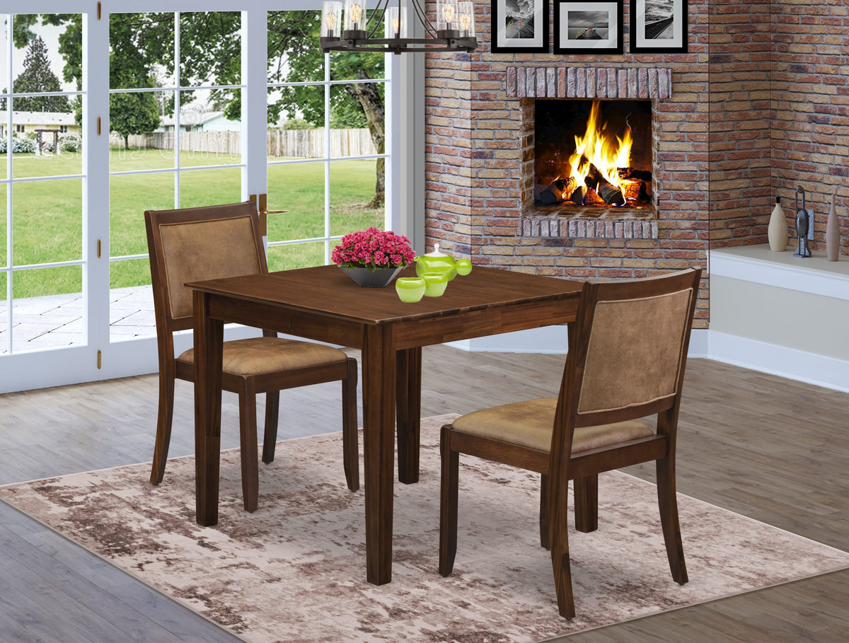Our elegant Dining Table Set comprises a finely crafted dining table accompanied by 2 stackable dining chairs. Exuding sophistication, this set is perfect for refined gatherings with friends and family. Its contemporary design seamlessly integrates into any interior decor, enhancing your space with exceptional versatility and charm. The dining table showcases a captivating Antique Walnut tabletop supported by 4 legs, elegantly matching the stylish dining chairs adorned with Brown Textured Faux Leather seats and an Antique Walnut finish. Crafted with meticulous attention to detail, the table is constructed from durable Rubber wood, while the chairs are fashioned from resilient Acacia wood, ensuring longevity and enduring quality. Our luxurious dining chairs provide plush seating, upholstered in premium Faux Leather for lasting comfort. Featuring high-resilience foam padding, these chairs ensure a comfortable dining experience for both you and your esteemed guests on every occasion.
