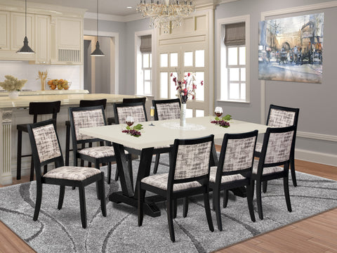 This exquisite kitchen table set enhances your home decor with its timeless elegance. It comprises a robust dining table and 8 stackable dining room chairs, each featuring a classic design. The wooden kitchen table boasts sleek legs finished in Wire Brushed Black, imparting a touch of refinement to your dining area. Its Linen White tabletop creates a striking contrast, elevating the dining set's overall aesthetic appeal. The dining chairs, upholstered in high-quality White and Gray Pattern faux leather, offer both style and comfort, complementing the dining table's finish impeccably. Matching the breakfast table's design, the stackable dining chair legs are also finished in Wire Brushed Black, ensuring a seamless look. Crafted from durable rubberwood, this dining set is built to endure daily use, guaranteeing years of reliability. Whether you're hosting a formal dinner or enjoying a casual family meal, this dining set combines elegance with functionality, making it an ideal addition to any dining space. Transform your dining room with this enduring and sophisticated kitchen table set.