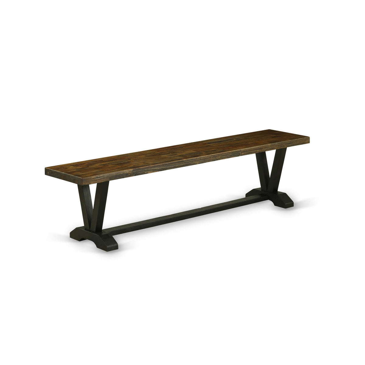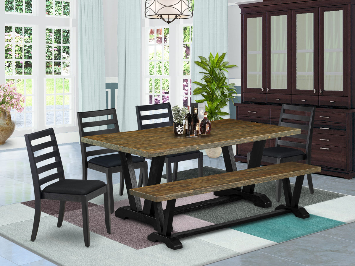 This mid century kitchen table set enhances the atmosphere of your home decor with its timeless charm. Comprising a sturdy kitchen table, a bench, and 4 stackable dining chairs, each boasting a classic design, it infuses your dining area with an elegant vibe. The breakfast table and bench feature sleek V-shaped legs finished in Wire Brushed Black, adding a touch of sophistication to the room. Its Distressed Jacobean top creates a striking visual contrast, elevating the overall appeal of the set. Upholstered in premium Black Linen Fabric, the kitchen chairs seamlessly blend style and comfort, perfectly complementing the aesthetics of the table. With legs mirroring the dining table's design and finished in Wire Brushed Black, they maintain a cohesive look. Crafted from durable rubberwood, this dining table set is designed to withstand daily use, ensuring years of reliable service. Whether you're hosting a formal dinner or enjoying a casual family meal, this kitchen table set effortlessly combines sophistication with practicality, making it an excellent addition to any dining space. Elevate the ambiance of your dining room with this enduring and refined dining table set.