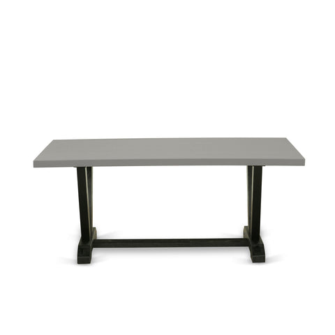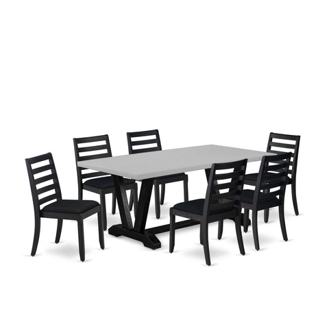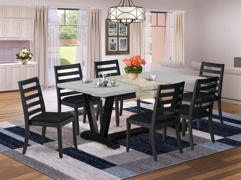 This contemporary kitchen table set enhances the ambiance of your home decor with its enduring appeal. Comprising a sturdy dinner table and 6 stackable kitchen chairs, each boasting a timeless design, it infuses your dining area with a touch of elegance. The breakfast table showcases sleek V-shaped legs finished in Wire Brushed Black, adding a refined accent, while its Cement tabletop creates a striking visual contrast, elevating the allure of the dining set. Upholstered in premium Black Linen Fabric, the dining room chairs seamlessly blend style with comfort, complementing the kitchen table's aesthetic. With legs echoing the design of the dining table and finished in Wire Brushed Black, they ensure a cohesive look. Crafted from durable rubberwood, this dining set is built to withstand daily use, ensuring years of dependable service. Whether hosting a formal dinner or enjoying a casual family meal, this kitchen table set effortlessly merges sophistication with functionality, making it an excellent addition to any dining space. Elevate the ambiance of your dining area with this enduring and refined dining table set.
