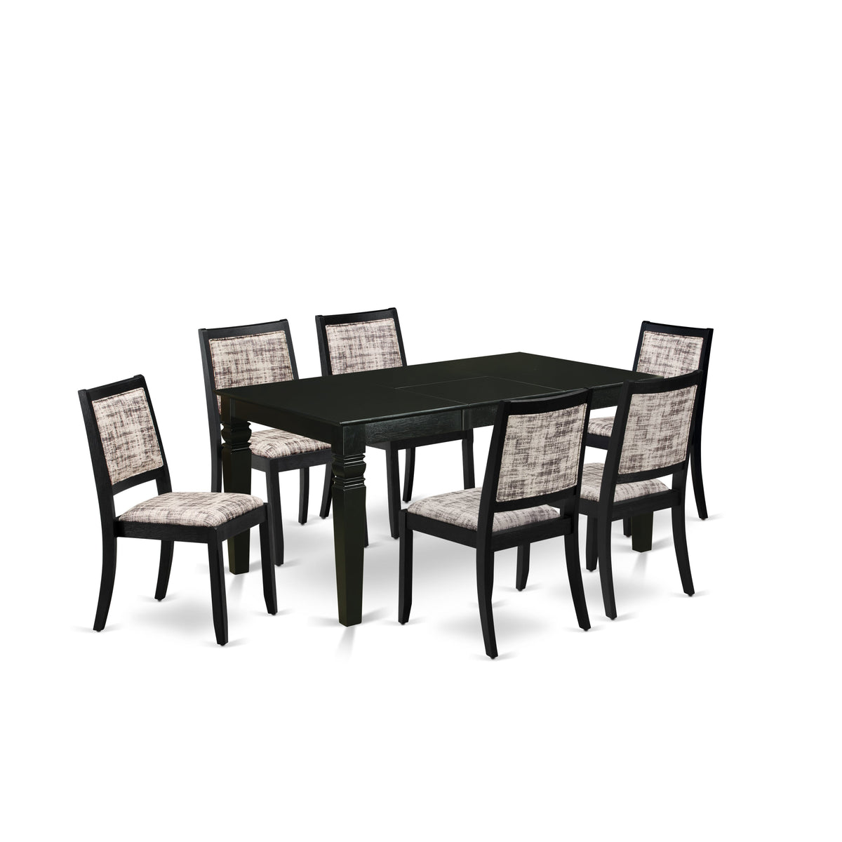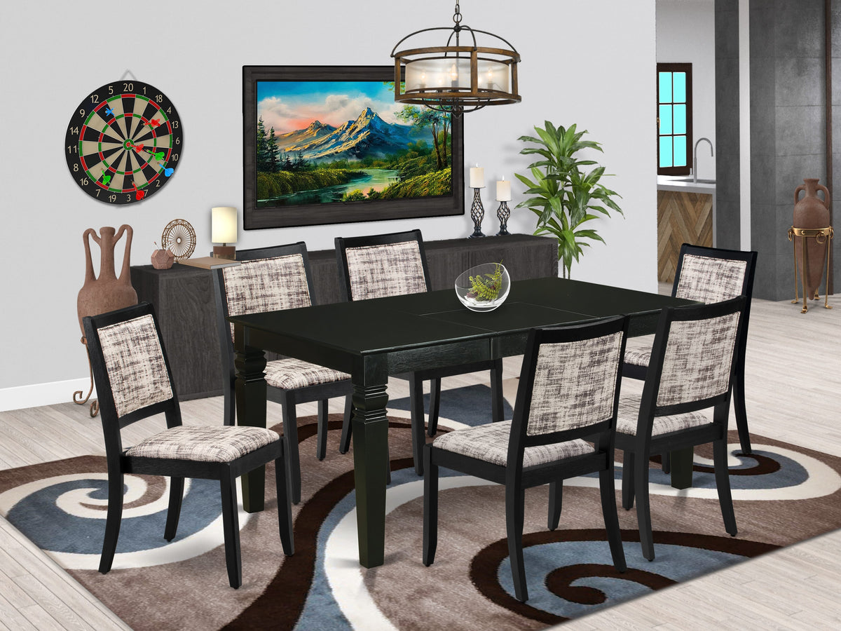 Our 7-piece dining set features a rectangular table and 6 stackable chairs designed to seamlessly adapt to various settings. The stackable chairs offer convenient storage and space-saving benefits. Both the dining table and chairs exude an elegant design, infusing refinement and contemporary flair into your living space. The table showcases a coordinated Black pattern on the tabletop and legs, perfectly complementing the stackable chairs finished in the same Black tone, resulting in a cohesive look. These chairs boast comfortable White & Grey Pattern Faux Leather seats, enhancing both the style and comfort of your dining area. Crafted with meticulous attention to detail, our dining set highlights a durable Rubberwood table and sturdy Rubberwood chairs. These chairs demonstrate exceptional resilience, ensuring your dining set maintains its stylish and sturdy allure for years to come, embodying elegance and enduring quality. Additionally, our chairs feature High-Quality Faux Leather seats, elevating their sophistication. Enhanced by a classic Padded back design, they exude timeless elegance. This fabric guarantees extended comfort and breathability, even with prolonged use, while its durability and minimal maintenance requirements ensure long-lasting functionality, further enhancing the overall appeal of the chairs.