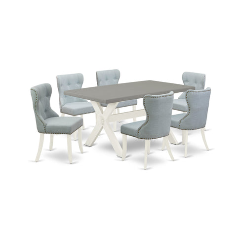 This 7-pc dining room table set consists of 6 parson dining chairs and 1 dining table. These dining padded chairs have a Linen Fabric seat, Button Tufted Chair Back, and the breakfast table includes a rectangular top and Wooden Cross Legs. The parson dining chairs seat, the chair back is made of Linen Fabric in a Baby Blue color upholstered dining chairs hardwood structure, and the Linen Fabric seat is quite easy to clean. You can clean dust quite simply and frequently to save time by using a damp cloth. These dining room chairs and the dining room table are the ideal choice for your dining room or kitchen. The simple design of the dining chairs and the rectangular table as well as screws of the same size allow a simple and fast build.