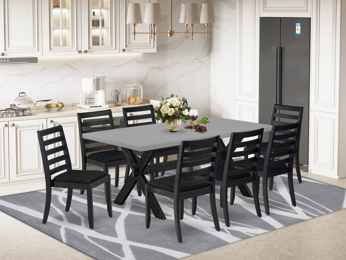 This dining table set enhances the elegance of your home decor, enriching the overall visual appeal of your living area. It consists of a sturdy dining table and 8 stackable kitchen chairs, each radiating timeless allure and effortlessly harmonizing with any dining arrangement. The breakfast table features sleek X-style legs finished in Wire Brushed Black, exuding sophistication, while the Cement tabletop provides a striking contrast, amplifying the charm of the entire set. The accompanying dining chairs blend comfort and style seamlessly, boasting premium Black Linen Fabric upholstery that emanates warmth and invites relaxation, perfectly complementing the tabletop's tones. Their stackable design echoes the grace of the kitchen table legs, adorned with a coordinated Wire Brushed Black finish for a cohesive look. Constructed from durable rubberwood, this dining table set is built to endure daily use, ensuring prolonged satisfaction. Whether you're hosting a formal dinner or enjoying a casual family meal, this kitchen table set effortlessly merges elegance with practicality, seamlessly fitting into any dining area. Elevate your dining experience with this enduring and sophisticated dining table set.