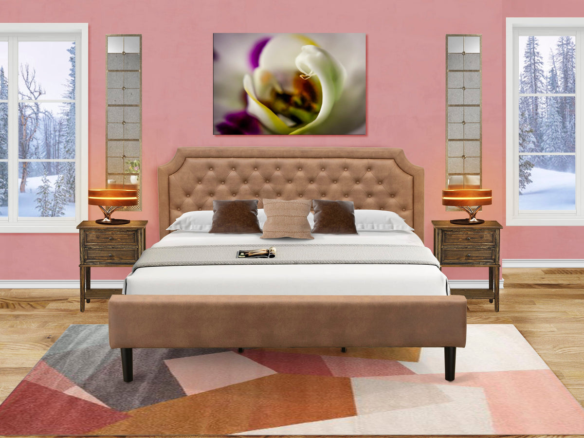 Our exquisite faux leather cushioned padding king bed frame will make any bedroom luxurious and comfortable to sleep in. We are offering a 3-piece king size bed set which contains 1 mid century bed with a headboard and 2 eye-catching end tables for bedroom. This king size bed frame is perfect for traditional bedrooms as well as a distinctive twist to any modern environment. Our wooden set for bedroom has 2 end tables with a traditional appearance.