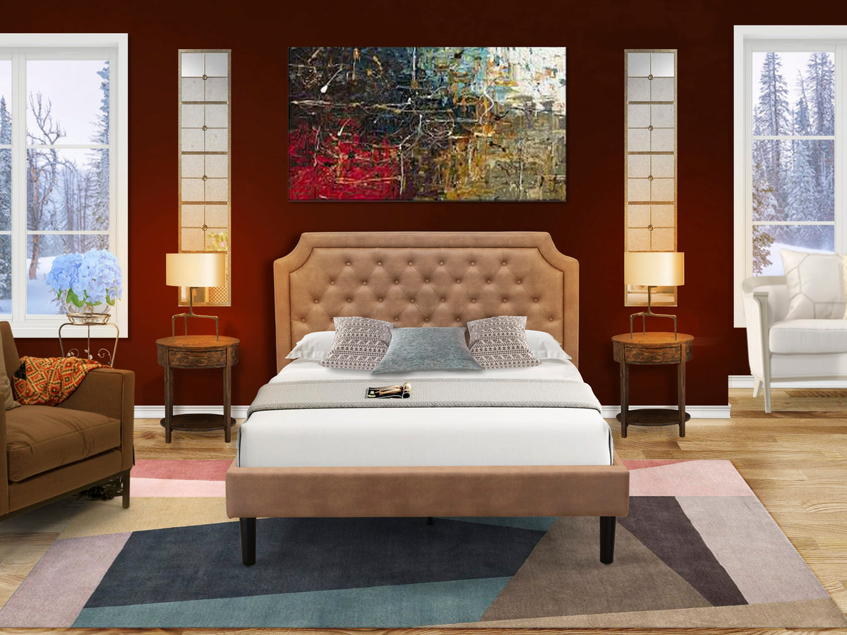 This fabulous faux leather cushioned padding mid century bed will make any bedroom luxurious and comfortable to sleep in. We are offering a 3-piece bedroom furniture set which contains 1 platform bed frame with a headboard and 2 appealing small end tables. This queen bed frame is great for conventional bedrooms and a unique twist to any modern environment. Our wooden set for the bedroom has 2 night stands with a classic appearance. Sturdy wood slats allow for better support and less sagging for both inner-spring and foam mattresses. Our bed set is simple to clean along with a damped cloth because of its smooth finish. This queen bed frame can be simply assembled with the provided step-by-step assembly instruction and equipment pack.
