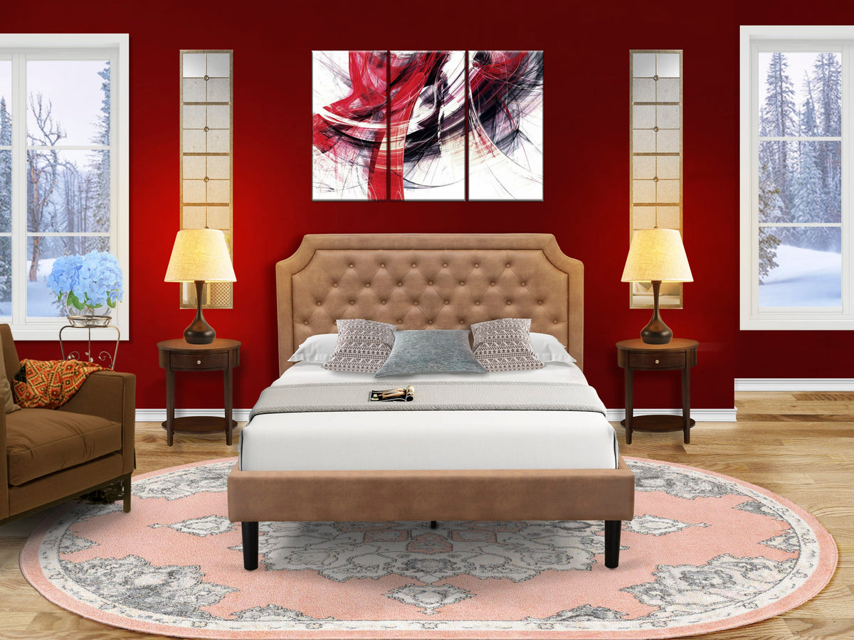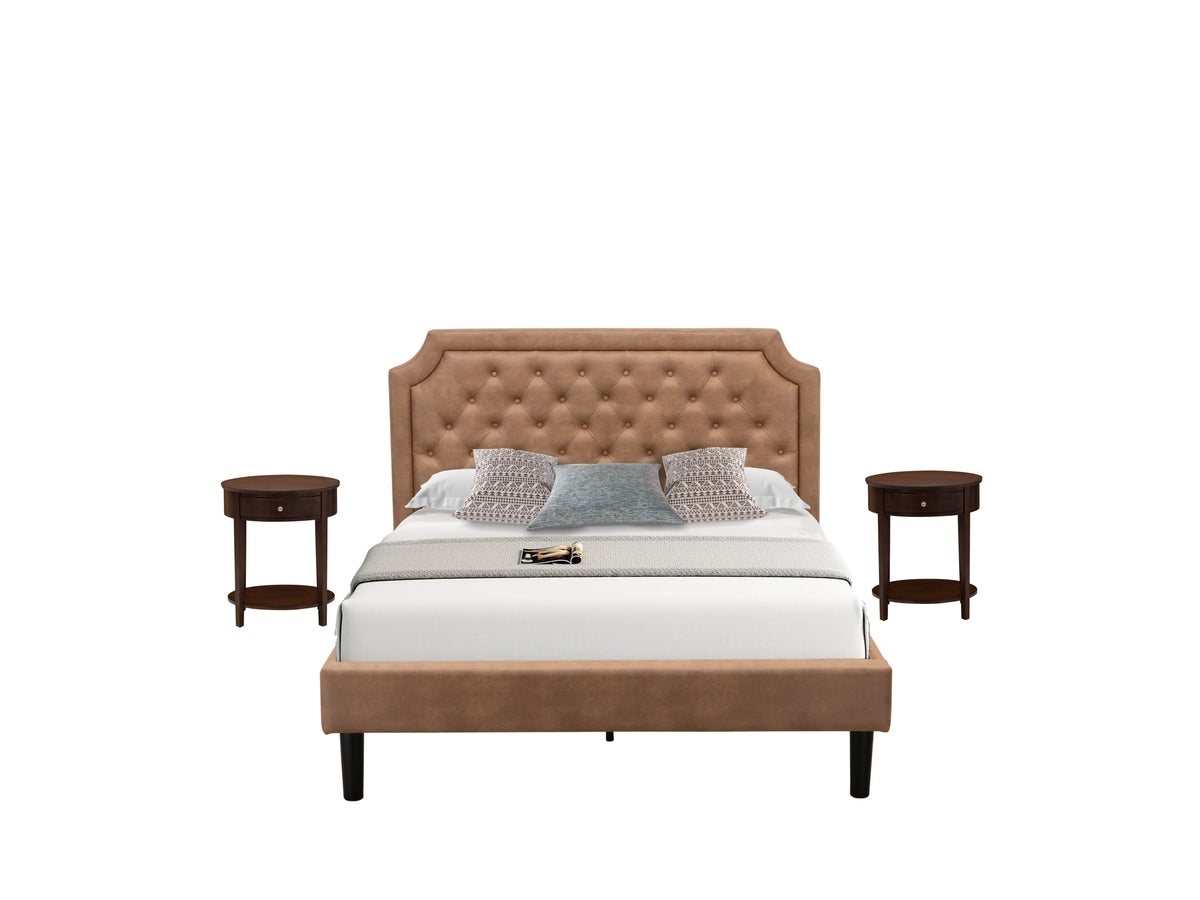 GB28Q-NSVPA, Elegant 3-Piece Mid-Century Style Queen Bedroom Ensemble with Button Accented Bedframe & Two Rich Mahogany Modern Nightstands - Coffee Faux Leather & Earth Tone Finish with Charcoal Legs On Sale