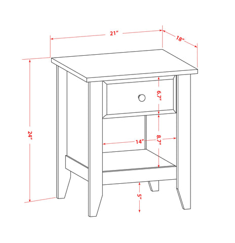 - Night Stand Dimensions: Length: 21; Width: 18; Height: 24.