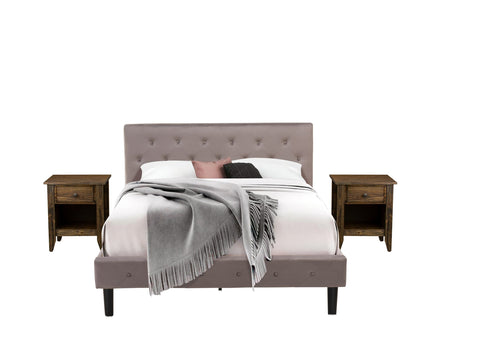 NL14Q-H3KQ0 3-Piece Bedroom Suite - Plush Velvet Queen Bed with Button Accents - Elegant Taupe Upholstered Headboard & Jacobean Style Nightstand