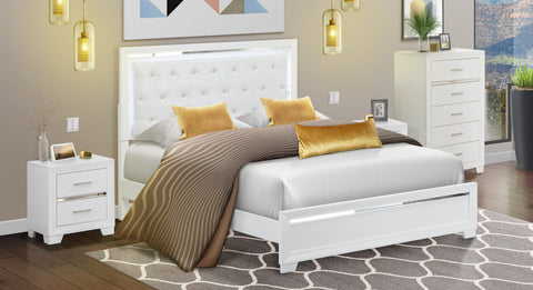 Our elegant white contemporary bedroom set makes a stunning addition to any bedroom in your home. Our 4-Piece bedroom set consists of 1 queen bed, 2 gorgeous nightstands, and 1 bedroom Chester with drawers. The bedroom set is a long term investment that will increase the value of any home and create beauty for a lifetime. The modern bedroom set comes with a Chester, providing plenty of space for your clothes and essential belongings. The Queen bed with LED light showcases a futuristic design, the modern wooden bed exudes expediency and usability. LED lights, gives your bedroom or even the whole living area a huge boost of aesthetic visual appearance in no time. This bedroom set is low maintenance and it is a perfect choice for budget-conscious families. Simple assembly required, All Hardware and tools provided. Our bedroom set is quite simple to clean and always gives a great appeal.