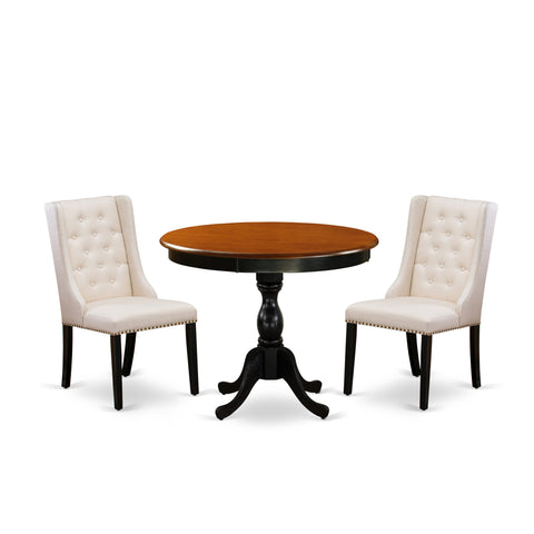 AMFO3-EH0-L3 Chic Dining Set 3-Piece Round Table with Pedestal and 2 Cream Upholstered Chairs, 36-Inch, Black & Cherry Elegance