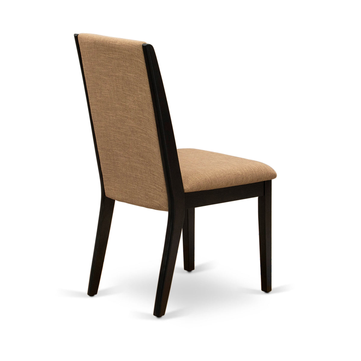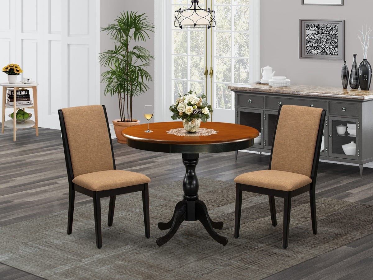 This table set comes in an innovative and clean-silhouette appearance, highlighting the splendor and luxurious design of the piece, making it a great centerpiece that blends into any decor. This 5-Piece dining set consists of a mid century dining table and 4 parson chairs suitable for enjoying in any home. The wood dining set is bound to add a certain amount of elegance to your home that you and your guests will enjoy. Perfect for dinette, kitchen, and dining areas, this dinner table set seat up to 4 people, excellent for families to enjoy meal times together. Our kitchen dining table has a Cherry Round Table top and Black Wooden Pedestal Leg, and dining chairs have a Light Sable Linen Fabric Seat and Black Wooden 4 Legs that allows you to sit cozily every time. This kitchen table set is manufactured from an excellent quality solid wood design, which is sturdy enough for years of use. This dining room table set comes in a contemporary and elegant design. Our dining set is not only sturdier and more steady but also more eye catching and inspired in style, providing elegance of charm for your dining room. Our dinner table set comes in easy parts that are easy to assemble. Easy-to-follow instruction is included in the package, and no additional tools are needed for assembly. Keep enjoying East West Furniture!