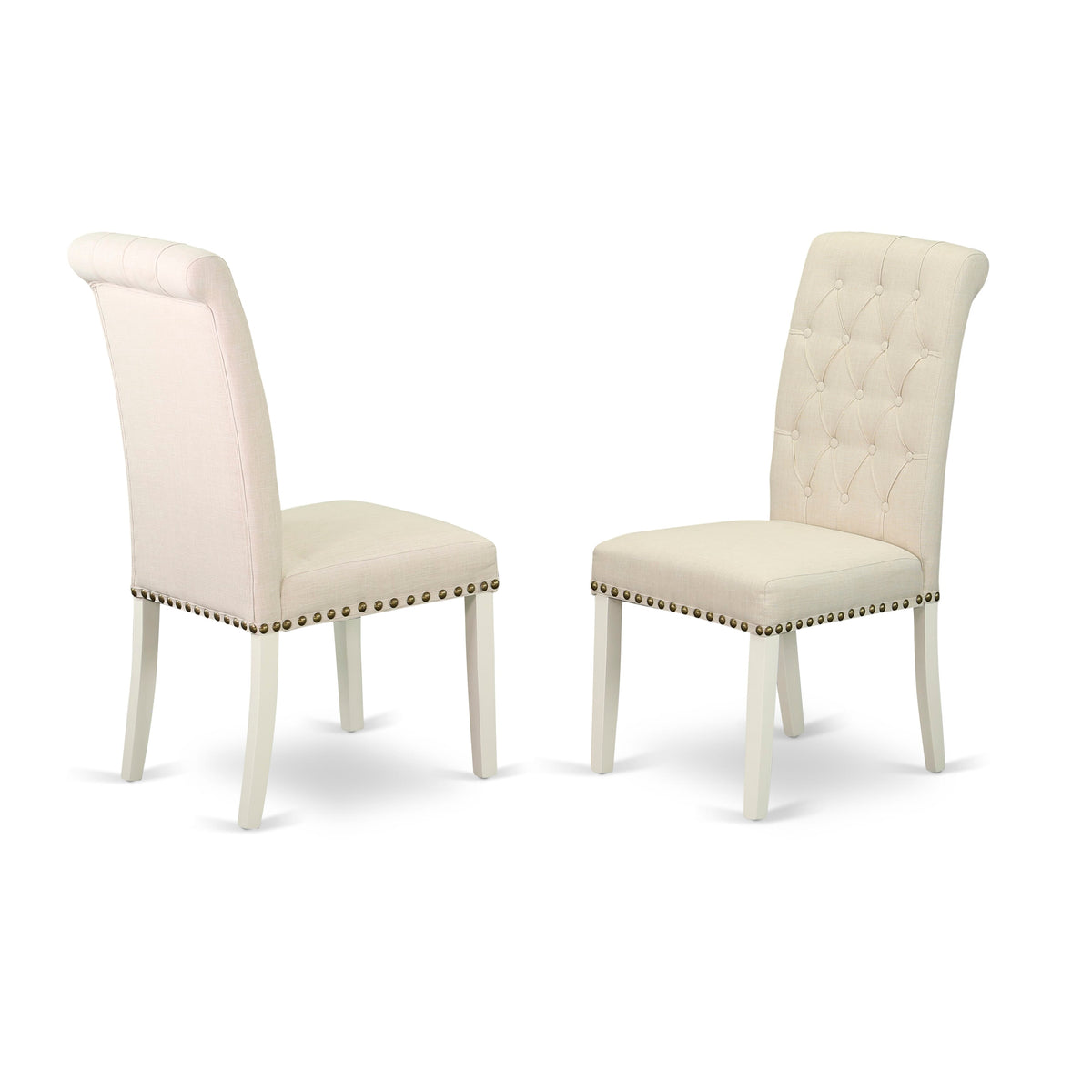 Attractive 3-piece wood dinette set for your amazing dining room. This small dining table set includes 2 gorgeous parson dining chairs and a fantastic 4 legs small table. This kitchen table set will improve the wonder of your dining area with its ageless style. Our dining chairs are fabricated of high-quality Linen Fabric, which gives complete comfort and a great sitting experience. The kitchen dinette set delivers a White Hardwood Round dining table and frame and a gorgeous Light Beige Linen Fabric parson dining chair seat and high roll back that offer magnificence to your dining room and increase the elegance of your amazing dining room. Our dining nook table set gives great durability because this is constructed with Asian wood, which is also known as Rubber wood. We have built these Button-tufted Parson dining chairs and Round table with the help of highly experienced carpenters that provides a smooth and high-end finish to this kitchen set. These elegant kitchen chairs and dining table are easy to assemble if you assemble this nook kitchen table set according to guidelines that are included in the package. Our wooden dining table set is easy to clean. You can clean this kitchen set with any furniture cleaner. It will just cost you a little time. The kitchen dining table set is very easy to clean and usually offers a fresh glance.