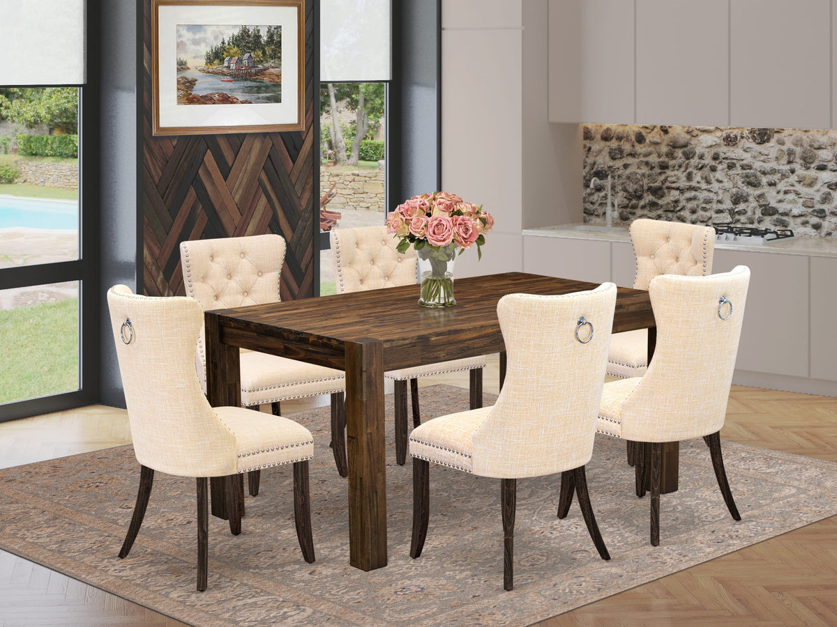 This stylish 7-piece kitchen table set effortlessly marries fashion, robustness, and functionality to enhance The ambience of your dining area. The dining set consists of a rectangular table with sturdy legs and 6 dining chairs, making it an exceptional choice for family gatherings, hosting guests, or casual dining occasions. It imparts a touch of sophistication to your home decor. The dining table set showcases a distressed Jacobean-style rectangular kitchen table paired with comfortable Light Beige kitchen chairs featuring rustic-style distressed Jacobean legs. This combination creates a charming rustic atmosphere in your dining space, setting The stage for a warm and contemporary environment for both family and guests. Constructed with precision from high-quality Asian wood, This dining table set ensures enduring durability and resistance to daily wear and tear. The dining chairs feature padded seats upholstered in Linen Fabric, ensuring exceptional comfort during extended dining sessions. Whether you're throwing a dinner party or enjoying a quiet family meal, These kitchen chairs offer cozy seating for extended periods. Assembling This dining room set is a straightforward task, designed for easy assembly and Includes all The necessary hardware and instructions.