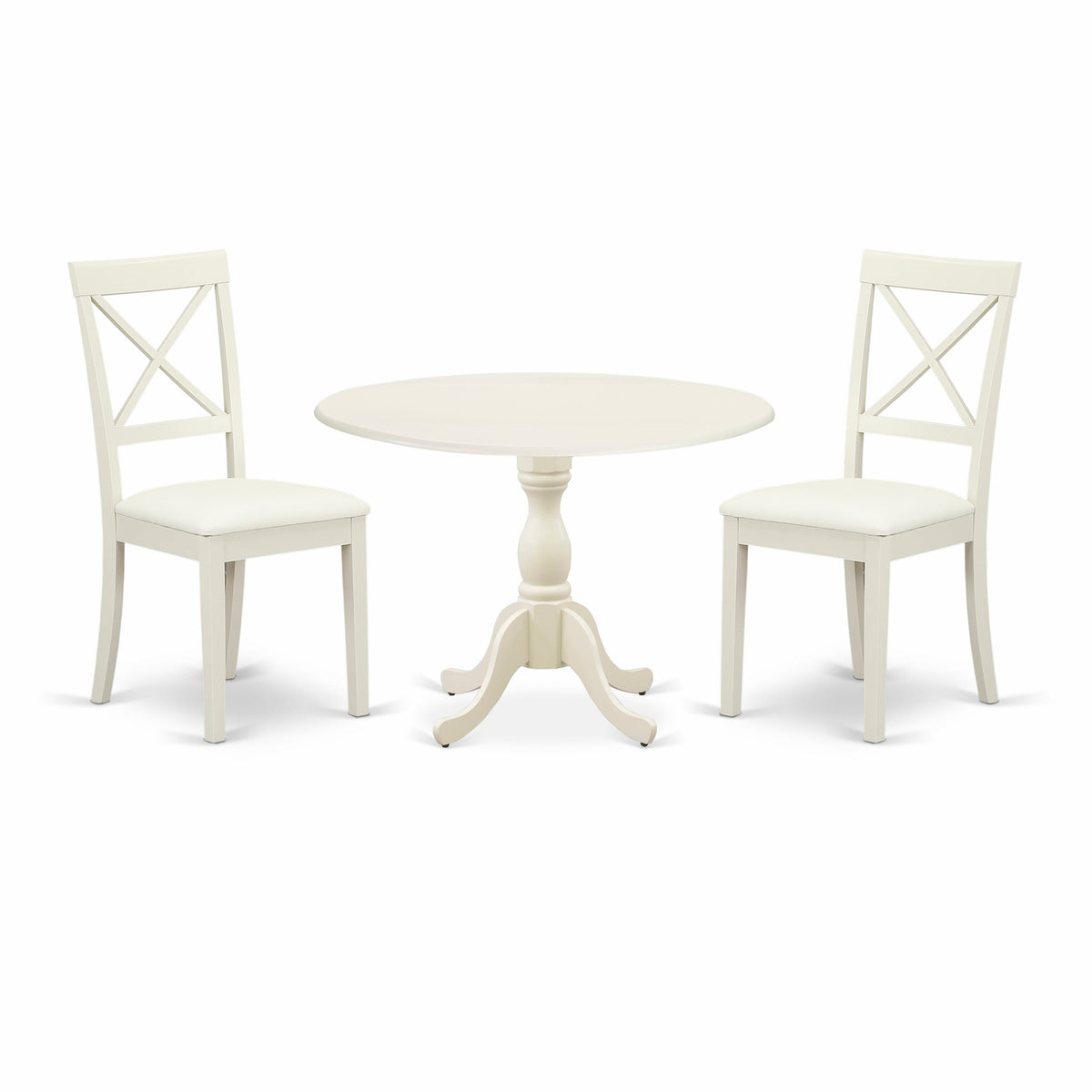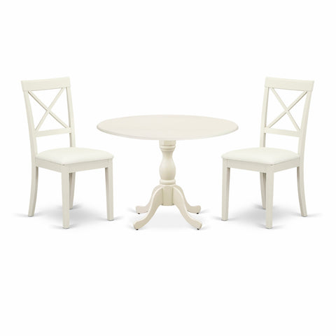 DMBO3-405-W 3-Piece Compact Dining Ensemble Dropleaf Table & Upholstered Chairs, 42x42 Linen White