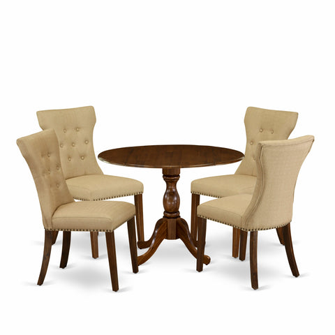 The Elegant 5 Piece kitchen table set includes 1 Drop Leaves dining table and 4 matching dining chairs. Our dining room chairs adds a sense of elegance to your room and the modern style is compatible seamlessly with any décor. The contemporary Button Tufted Chair Back of this dining room chair blends beautifully with the Linen Fabric seat, creating a sophisticated appearance. Boasting soft Linen Fabric upholstery, fine nail head trim with spring support, a comfortable padded cushion, and a solid natural wood frame chair is overflowing in both quality and design. This round pedestal table is designed in classical style. In addition, the Antique Walnut color match Linen Fabric upholstered dining chairs creating their appearance more attractive. The Spacious tabletop created from excellent quality Rubber Wood material help for heightened durability and long-lasting use. Designed with easy and fast assembly in mind, each set comes conveniently packed with easy to follow instructions and all necessary tools included. This contemporary, budget-friendly, durable and comfortable modern dining table set can be a great choice if you are appearing for a great dining time experience with family and friends.