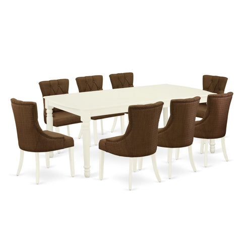 Dining Ensemble Set DOFR9-NG5-Q1 9-Piece Rectangle Table with Butterfly Leaf and 8 Brown Fabric Chairs, Linen White Finish, Size 42x78