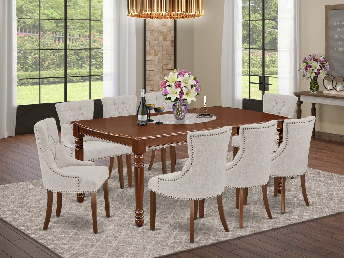 Quality is made attainable with this exclusive DOFR9-IKS-DL dining set includes a rectangular dinette table and eight parson chairs. The dining table can fit maximum of 8 people in the dining area. The table's 4 straight leg support brings a simple and breezy style to any space, making it incredibly easy to incorporate into any dining room. The Kitchen table includes a built-in 18 inch self-storage expansion leaf which can be stored right beneath table the top. The wooden table is created from prime quality rubber wood known as Asian Hardwood. No heat treated pressured wood like MDF, particle board or veneer top fabricated. A regal and affordable Parson chair offers a touch of beauty to any dining room and provides a sensible seating arrangements. The upholstered parson chair features a beautiful stitched exterior. Standard back, Linen Fabric, Button tufted high-density foam padding, solid hardwood frame construction, comfortable, durable and attractive. Whether you use this dining chair is an easy to assemble and stylish answer to your seating needs. This budget friendly, durable and comfortable dining set can be good choice if you are looking for a great dining time experience with your family or friends.