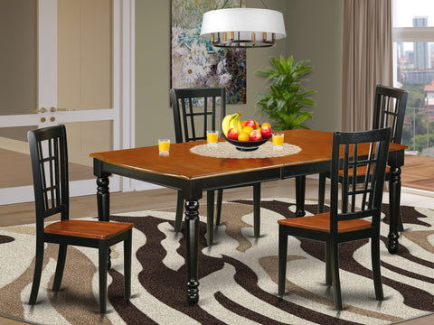 This kitchen table set has 4 chairs with solid wood seats. It is completed with a leveled table top. The dining table can fit a maximum of 8 people in a dining area. The dining set boasts a two-toned Black & Cherry color that comes across as an effective additional color to your dining space given its attractive color on the seats. The table's 4 straight leg support brings a simple and breezy style to any space, making it incredibly easy to incorporate into any dining room.