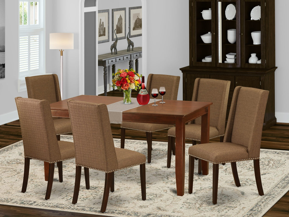 This dining room set includes 6 fantastic Dining Chairs and an incredible 4 legs rectangle table. The modern rectangular dining table set delivers a Mahogany solid wood dining room table and structure and a fantastic Brown Beige Dining Chairs seat and high back that bring magnificence to your living area and boost the charm of your great dining room. The high-quality of our attractive chairs helps our wonderful customers to get relaxation and feel free when getting their meal. This wood dining table constructed from good quality rubber wood which can bear the weight of 300 Lbs. Our parson dining chairs have a wooden structure with a luxury seat of high-quality foam which is covered with Linen Fabric that provides you relaxation with friends or family. This listing has a premium color of Mahogany finish for rectangle table and Brown Beige finishes upholstered dining chairs. Our wonderful premium colors increase the beauty of your dining area and give a magnificent appearance to your dining area or dining area. East West Furniture always crafted from modern furniture along with easy assembling parts. We try to keep our furniture parts innovative as well as simple. Our high-class rectangular dining table set is ideal for your stunning dining area as well as the kitchen. You can use it for casual home parties. Keep enjoying East West modern furniture!
