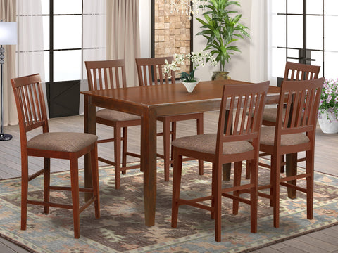 This rectangular counter height table sets have stunning Asian superb solid wood with an Mahogany finish. Choose a superb padded style seat to enhance your dining-room set. Counter height dining chair feature a slatted back design for max comfort level when sitting down. Pub table offers a lot of space for your large family with many people. Classy design kitchen table along with straight legs make this by far the most versatile counter height table together with chairs sets.