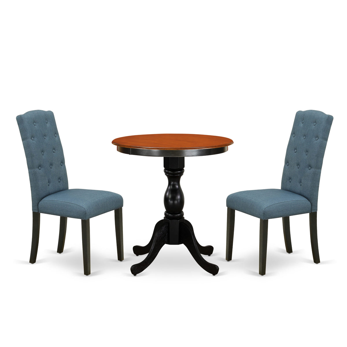 Our attractive 3-piece kitchen table set offers a gorgeous look to any beautiful dining area. This 3-piece kitchen table set provides 2 modern dining chairs and a kitchen table that brings a beautiful check to your dining room. Our modern dining set is manufactured from premium quality rubber wood that is known as Asian Wood. This dining room table gives a smooth, durable surface and wood pedestal base that can hold up to daily use. These padded parson chairs include a Linen Fabric Seat with a Button Tufted Back and 4 Hardwood Legs. This wood table has a cherry Tabletop and black color pedestal legs finish. The eye-catching color combinations of our modern dining table set provide an impressive glance to any living room. You can give a stylish and charming glance to your living area with the help of our attractive modern dining table set. Our kitchen dining table set is more convenient to clean with a damp cloth. To make the assembly of this modern dining table set as effortless as possible we have included quite clear and detailed instructions, numbered parts, and all necessary tools in the package, so it is easy to assemble.