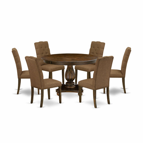 This modern dining set provides 6 dining chairs and a mid century dining table to boost the beauty of any kitchen area or dining area. This modern dining table is offered in a beautiful Distressed Jacobean finish. Moreover, the modern chair in a Brown Linen Fabric boosts the beauty of any home. Ideal for dinette, kitchen, and dining areas, this multi-functional dinette set seats up to 6 people, great for families to enjoy mealtimes together. This modern kitchen table has a Distressed Jacobean Round table top and Distressed Jacobean Pedestal Legs. Our Nailhead upholstered chairs have Brown Linen Fabric and Distressed Jacobean Wooden 4 Legs. We designed this modern dining room set using only top quality and durable materials. Designed with easy and fast assembly in mind, each set comes conveniently flat packed with easy-to-follow instructions and all necessary tools included. This contemporary, budget-friendly, durable and comfortable mid century modern dining set can be a good choice for you and your family if you enjoy the dining experience. Our kitchen dining table set is quite easy to clean and always gives a good appeal. Enjoy with East West Furniture!