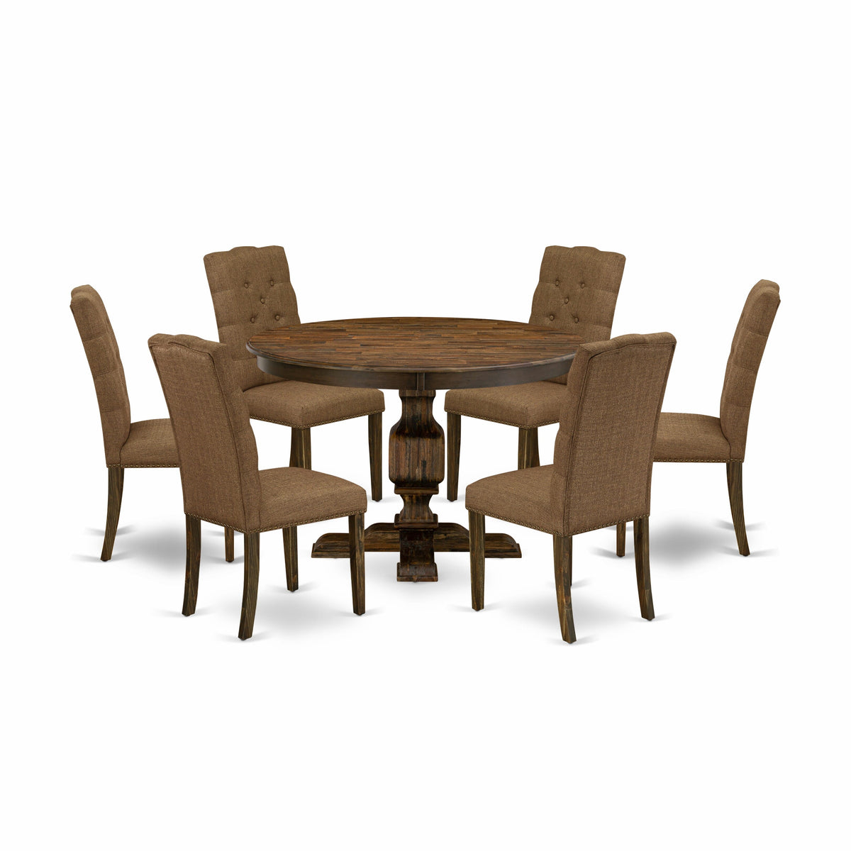 This table set offers 6 mid century chairs and a mid century modern dining table to boost the beauty of any kitchen area or dining area. This dining table is provided in an elegant Distressed Jacobean finish. Moreover, the modern dining chairs in a Brown Linen Fabric boost the beauty of any home. Ideal for dinette, kitchen, and dining areas, this multi-functional dining set seats up to 6 people, perfect for families to enjoy mealtimes together. This dining table has a Distressed Jacobean Round table top and Distressed Jacobean Pedestal Legs. Our Nailhead padded chairs have Brown Linen Fabric and Distressed Jacobean Wooden 4 Legs. We designed this innovative dining room set using only high quality and durable materials. Designed with simple and fast assembly in mind, each set comes conveniently flat packed with easy-to-follow instructions and all necessary tools included. This contemporary, budget-friendly, durable and comfortable dining table set can be a good choice for you and your family if you enjoy the dining experience. Our table set is quite simple to clean and always gives a good appeal. Enjoy with East West Furniture!
