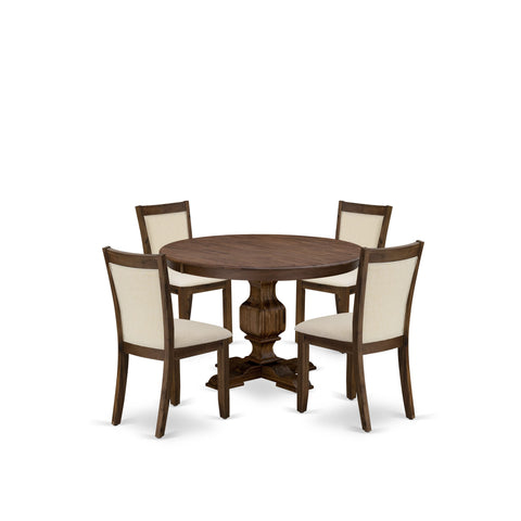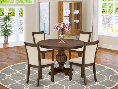F3MZ5-51-CP 5-Piece Dining Set Round Table with Pedestal & 4 Linen Chairs, Sandblasting Antique Walnut