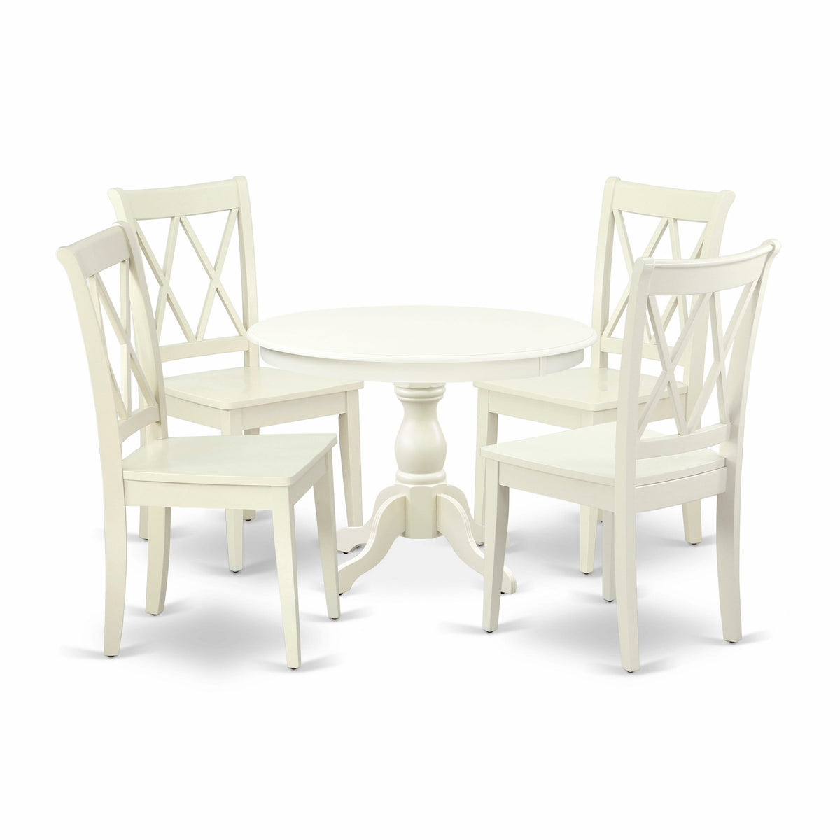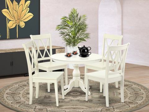 Our 5-Piece dinette set provides a round wood table and 4 wooden dining chairs which can fully accommodate your family. This dining room set features a sophisticated and eye catching appearance. The elegant design and Rustic, Linen white kitchen chair is perfect to match any dining room. Upgrade your interior decor with our antique style dining room set. Linen White textured finish adds a unique allure to any dining room while the wooden legs of both wood chairs and small kitchen table will certainly help you to enhance the solidness and traditional feel. The contemporary style dining room table set adds a touch of elegance to the home that you and your family will absolutely enjoy. These wooden dining chairs bring you an incredibly relaxing experience because it has double X-back and cone-shaped legs. Having a smooth surface, our dining table set is easy to clean by using a wipe down to get hassle-free maintenance. Assembly of our modern dining table set requires a short amount of time and it will be easy to assemble if you will follow the step-by-step guidelines.
