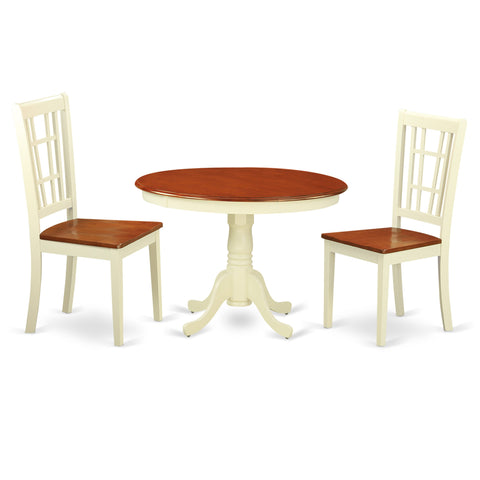 HLNI3-8ZU-T - 3 Piece Compact Dining Set with Rounded Table on Pedestal and Two Chairs, Buttermilk & Cherry