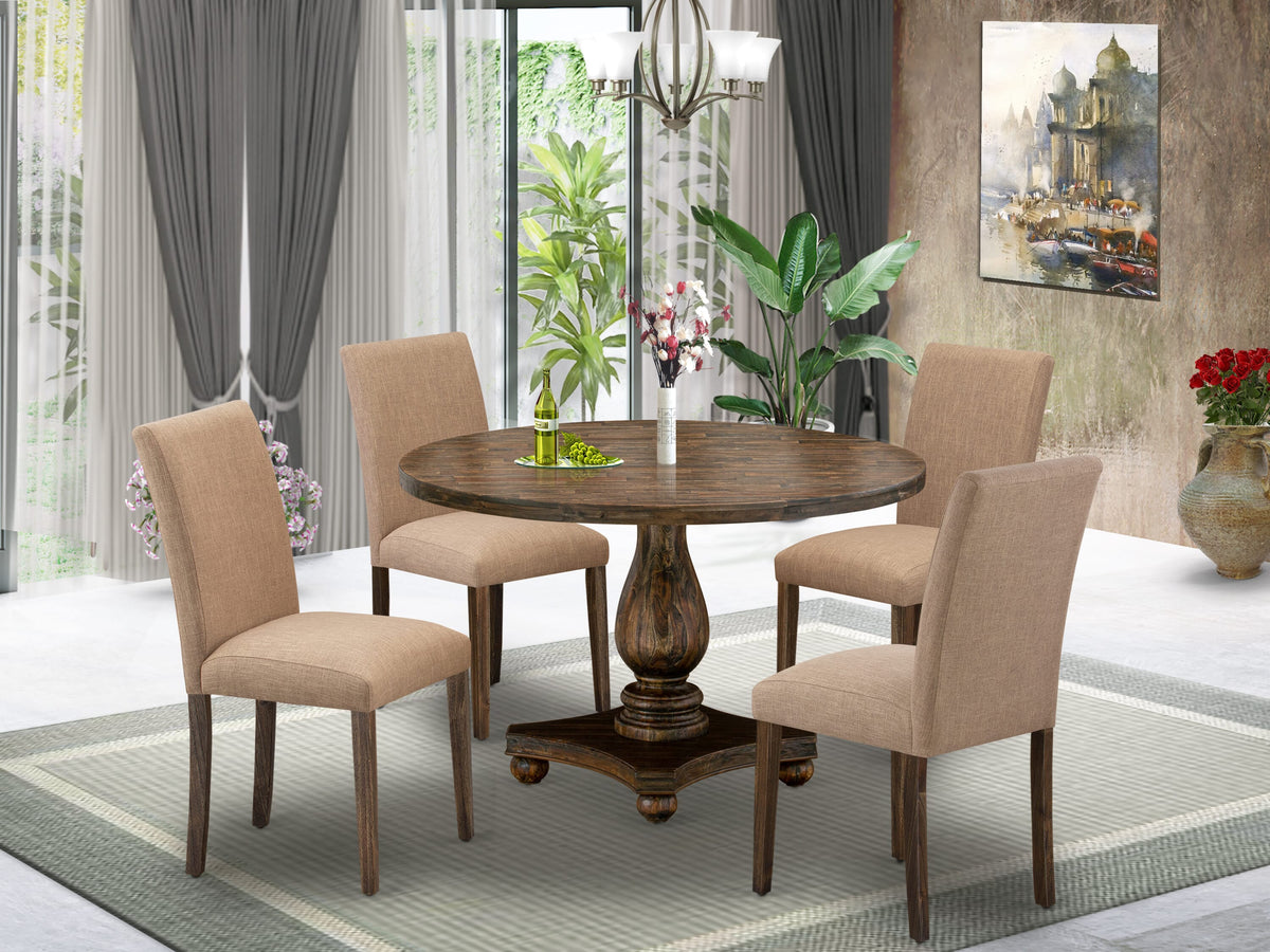 I2AB5-XCC - 5 Piece Dining Ensemble with Round Pedestal Table & 4 Linen Upholstered Seats, 48x48 Distressed Jacobean