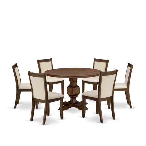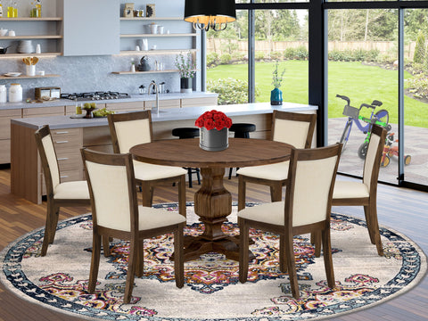 This dining room set provides a dining table and 6 modern chairs to increase the beauty of any kitchen or dining area. This kitchen table is available in an attractive Sand Blasting Antique Walnut finish. Additionally, the dining room chairs in a Light Beige Linen Fabric boost the beauty of any home. Appropriate for dinette, kitchen and dining areas, this dining table set seats up to 6 people, good for families to enjoy mealtimes jointly. This dining room table has an Sand Blasting Antique Walnut Round tabletop and a Pedestal Leg. We specially designed this kitchen table set using premium quality and sturdy materials. This modern dining set is made with easy and fast installation in mind. Our every set comes conveniently flat with easy-to-follow instructions and all required equipment involved. This contemporary, budget-friendly, sturdy and comfortable dining room set can be a good option for you and your family if you enjoy the dining experience. Our kitchen set is easy to clean and always provides a good elegance.