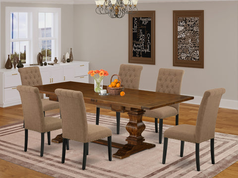 It Wood Dining Set consists of 6 eye-catching upholstered dining chairs and a wonderful Pedestal legs kitchen table. The Wood Dining Set gives an Antique Walnut solid wood rectangular dining table and fantastic dining room chairs that will boost the elegance to your dining room. This mid century dining table is produced from premium quality rubber wood. These kitchen chairs have built from top quality wood that can Endurance to 300lbs weight. This Rectangular Wood Dining Set has colored with a good quality Antique Walnut and Black finish. The kitchen chairs is one of the most important pieces of furniture in your house. It not only becomes the place to eat meals, but it's where you end up working on vegetables cut and spending time with family and friends. You can also use it for casual home parties. That's why it's important to find a Dining Room Set that fits your personality and uses the space wisely. The options are endless, so it's important to pick what works best for you. If you are looking to bring a contemporary appearance to your kitchen or dining room, this Dining Room Set might be the perfect choice. This dining room table and kitchen parson chairs are ideal for any room décor. Bring a rustic, trendy seem to your dining room with this set that seat 6 people around the dining room table. You can clean this Table Set easily with any furniture clearance. This Wood Dining Set assembles easily because of its simple design. You can construct this Dining Room Set one place to another quickly. Just because you have a small area or for your pedestal dining table does not mean you have to sacrifice on quality or glance. Keep enjoying with East West furniture!