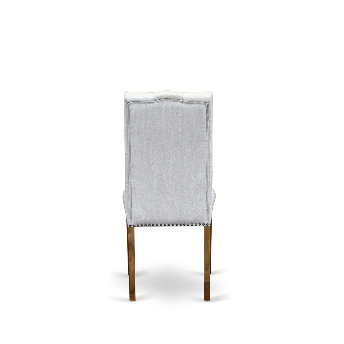 Our dining set will enhance the attractiveness of any dining area with its elegant style. This 11-Pc dining set contains a wood table and 10 matching dining room chairs. Our kitchen table set adds some simple and contemporary beauty to your home. Ideal for dinette, kitchen, and dining areas, this dining table set seats up to 10 people with a kitchen table perfect for family style dinners, and meals with friends. This dinner table has a Distressed Jacobean Rectangular Table Top and a Double Pedestal finish. These dining chairs have Grey Linen Fabric seats and Antique Walnut Wooden Chair Legs. The dining room chairs feature a Linen Fabric seat and Button Tufted Back, while the back of the parson chairs is outlined in a wood frame and the center of the back is padded. The structure of this dining room set is manufactured from high quality Rubberwood which offers good strength and stability. We have made this dining set with the help of highly experienced carpenters, who produce a smooth and high quality finish to this dining set. Our dining set is quite easy to clean and always gives an elegant appeal. Keep Enjoy with East West Furniture!