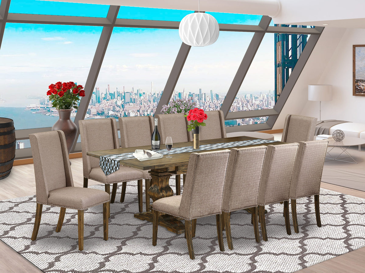 Our dining table set will boost the attractiveness of any dining room with its elegant style. This 11-Piece dining set contains a wood table and 10 matching parson chairs. Our kitchen dining table set adds some simple and contemporary elegance to your home. Ideal for dinette, kitchen, and dining areas, this dining table set seats up to 10 people with a dining table perfect for family style dinners, and meals with friends. This mid century table has a Distressed Jacobean Rectangular Table Top and Double Pedestal Legs finished. These kitchen chairs have Dark Khaki Linen Fabric seats and Distressed Jacobean Wooden Chair Legs. The dining chairs feature a Linen Fabric seat and High Back, while the back of the dining chairs is outlined in a solid wood frame and the center of the back is padded. The design of this dining set is made from top quality Rubberwood which provides good strength and stability. We have created this dining table set with the help of highly experienced carpenters, who generate a smooth and high quality finish to this dining room set. Our dining table set is easy to clean and always provides a beautiful appeal. Keep Enjoy with East West Furniture!