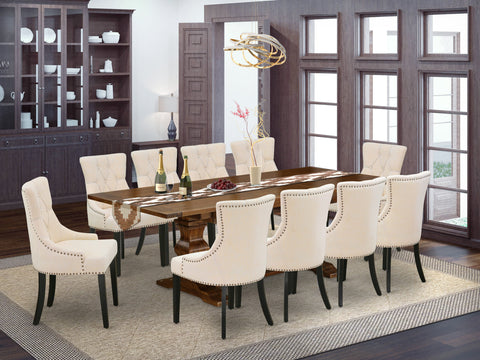 Our Dining Set boosts the elegance of any kitchen area. This 11-piece dining room set consists of 1 dining table and 10 matching parsons chairs. The kitchen table set is made of fine RubberWood for good quality and strength. A rectangular-shaped dining table is built in an exclusive design with specific aspects, and linen fabric kitchen & dining room chairs inspire everyone who comes to the dining room. This dining room table set seats up to 10 people with a wooden dining table great for family style dinners and meals with friends. This wood dining table has a Butterfly leaf tabletop and double wooden pedestal legs. The modern and trendy design of the dining table set easily blends in any kitchen. Our kitchen table chairs are top-quality Linen Fabrics offering complete comfort and an awesome sitting experience. Our nailhead parson chairs have a Light Beige Linen Fabric seat and Black chair legs. These fantastically modern dining chairs create a warm, inviting atmosphere. The Padded seat and backrest of the wood dining chairs of Linen Fabric raise the wooden table design. Our dining set always offers a stylish appeal. The installation process of our dining room set is not difficult straightforward to operate. Each rustic modern dining table set comes conveniently with easy-to-follow instructions and all necessary tools included. You need to follow the steps in the handbook to complete the installation in a short time.