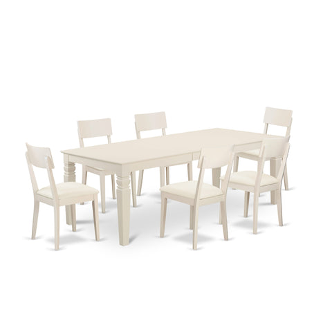 This grand dining set features our largest table - which can extend out up to 84 in length. Treat your room's decor with a new and polished look with this modern 7 Piece Dining Set. Withstand just about any dinner party with this sturdy table which is based on 4 straight legs. The set is offered with 6 solid wood dining chairs with a comfortable faux leather seat for simplicity and ease. Finished in a marvelous Linen White, this piece is certainly an eye-opener.