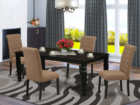 Spice up your dining area with this LGBR5-RX4-XI grand dinette set includes a timeless missionary design large dinette table and four parson chairs. A contemporary twist on a classic design, the eye appealing design of this dinette set liven up your dining space. This rectangular sturdy wooden table based on 4 straight legs with carved design has plenty of space for 4-8 people to sit and enjoy their meal comfortably. The dining table integrates an 18 inch self-storage extension leaf which can be stored right beneath the table top. This wonderful kitchen table makes a really great addition for all kitchen space and corresponds all sorts of dining-room concepts. A regal and affordable Parson chair offers a touch of beauty to any dining room and provides a sensible seating arrangements. The upholstered dining chair features a beautiful stitched exterior. Tall back, Linen Fabric, high-density foam padding, solid hardwood frame construction, comfortable, durable and attractive. Whether you use this kitchen chair is an easy to assemble and stylish answer to your seating needs. The standard shape, size and design makes the dining area significantly attractive. This contemporary, budget friendly, durable and comfortable dinette set can be good choice if you are looking for a great dining time experience with your family or friends.