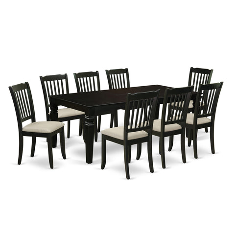 Spice up your dining area with this LGDA9-RDF-H grand dining set includes a timeless missionary design large dinette table and eight dining chairs. A contemporary twist on a classic design, the eye appealing design of this dining set liven up your dining space. This rectangular sturdy wooden table based on 4 straight legs with carved design has plenty of space for 4-8 people to sit and enjoy their meal comfortably. The dining table integrates an 18 inch self-storage extension leaf which can be stored right beneath the table top. This wonderful kitchen table makes a really great addition for all kitchen space and corresponds all sorts of dining-room concepts. This eye-catching Danbury dining room chair offers a modern and sophisticated look. The Kitchen dining chairs come with a Linen upholstery seat to fit personal preference and perfect design. This Stylish dining chair features curved front legs. Elegant kitchen chairs feature 7 vertical slats to give any dining area a touch of class and sophistication. Finished in elegant Black Color. This budget friendly, durable and comfortable dining set can be good choice if you are looking for a great dining time experience with your family or friends.