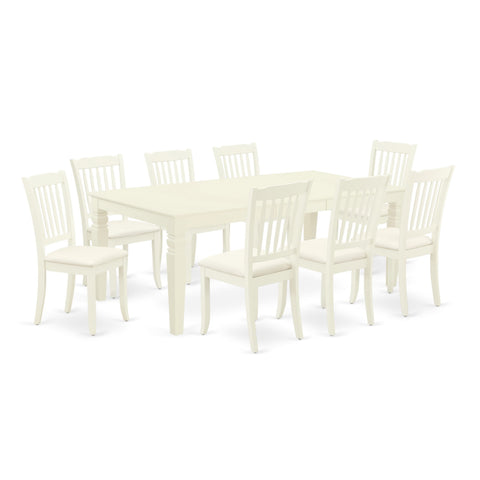 Spice up your dining area with this LGDA9-YQY-L grand dining set includes a timeless missionary design large dinette table and eight dining chairs. A contemporary twist on a classic design, the eye appealing design of this dining set liven up your dining space. This rectangular sturdy wooden table based on 4 straight legs with carved design has plenty of space for 4-8 people to sit and enjoy their meal comfortably. The dining table integrates an 18 inch self-storage extension leaf which can be stored right beneath the table top. This wonderful kitchen table makes a really great addition for all kitchen space and corresponds all sorts of dining-room concepts. This eye-catching Danbury dining room chair offers a modern and sophisticated look. The Kitchen dining chairs come with a Linen upholstery seat to fit personal preference and perfect design. This Stylish dining chair features curved front legs. Elegant kitchen chairs feature 7 vertical slats to give any dining area a touch of class and sophistication. Finished in luxurious Linen White Color. The standard shape, size and design makes the dining area significantly attractive. This budget friendly, durable and comfortable dining set can be good choice if you are looking for a great dining time experience with your family or friends.