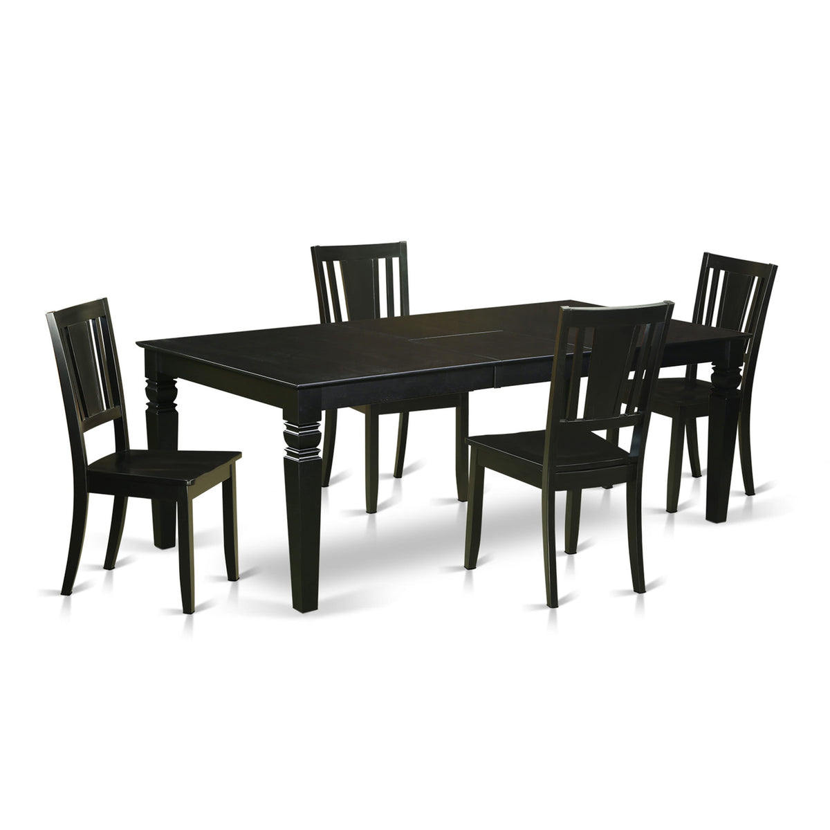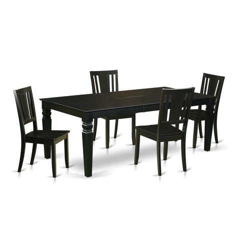This Beautiful Dining Room Set Is Similar To Timeless Missionary Design And Adds A Stylish, Modern Touch To Any Kitchen Area Or Dining Room. This Particular 5 Piece Dining Room Table Set With 1 Table And Four Kitchen Chairs. Premium Quality Dining Set Which Made From 100% Asian Hardwood. Simply No Mdf, Veneer, Laminate Include With Our Items. This Table Integrated An 18 In Self Storage Extension Leaf Which Can Be Stored Right Beneath Table Top. The Rectangular Table Is Finished In A Pleasant, High Sheen Black Which Is Easy To Maintain And Polish. This Table Features Strong Square Legs With Carved Design And Plenty Of Space For Individual Comfort. The Straight Back Chairs Are Perfect For Both Formal And Casual Social Gatherings. 5 Piece Dining Room Set With One Logan Dinning Table And 4 Wood Seat Dining-Room Chairs Finished In A Luxurious Black Color.
