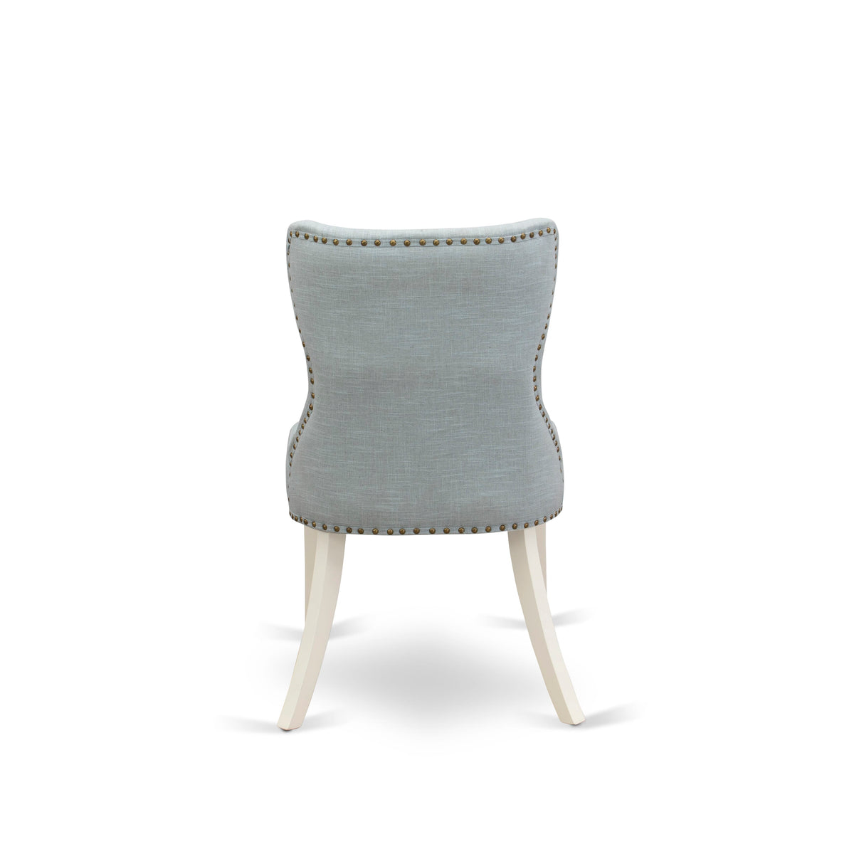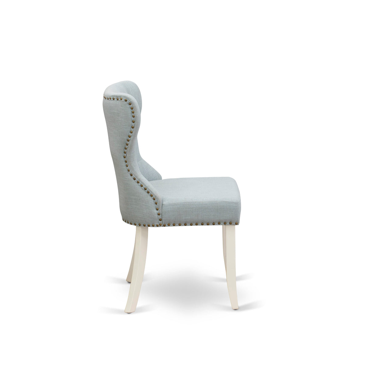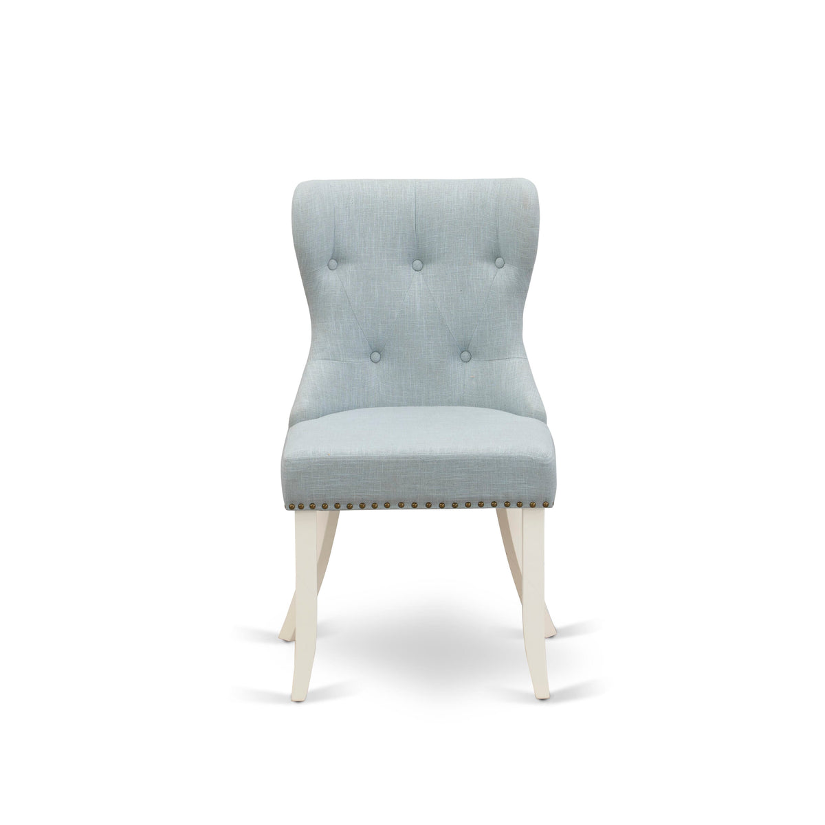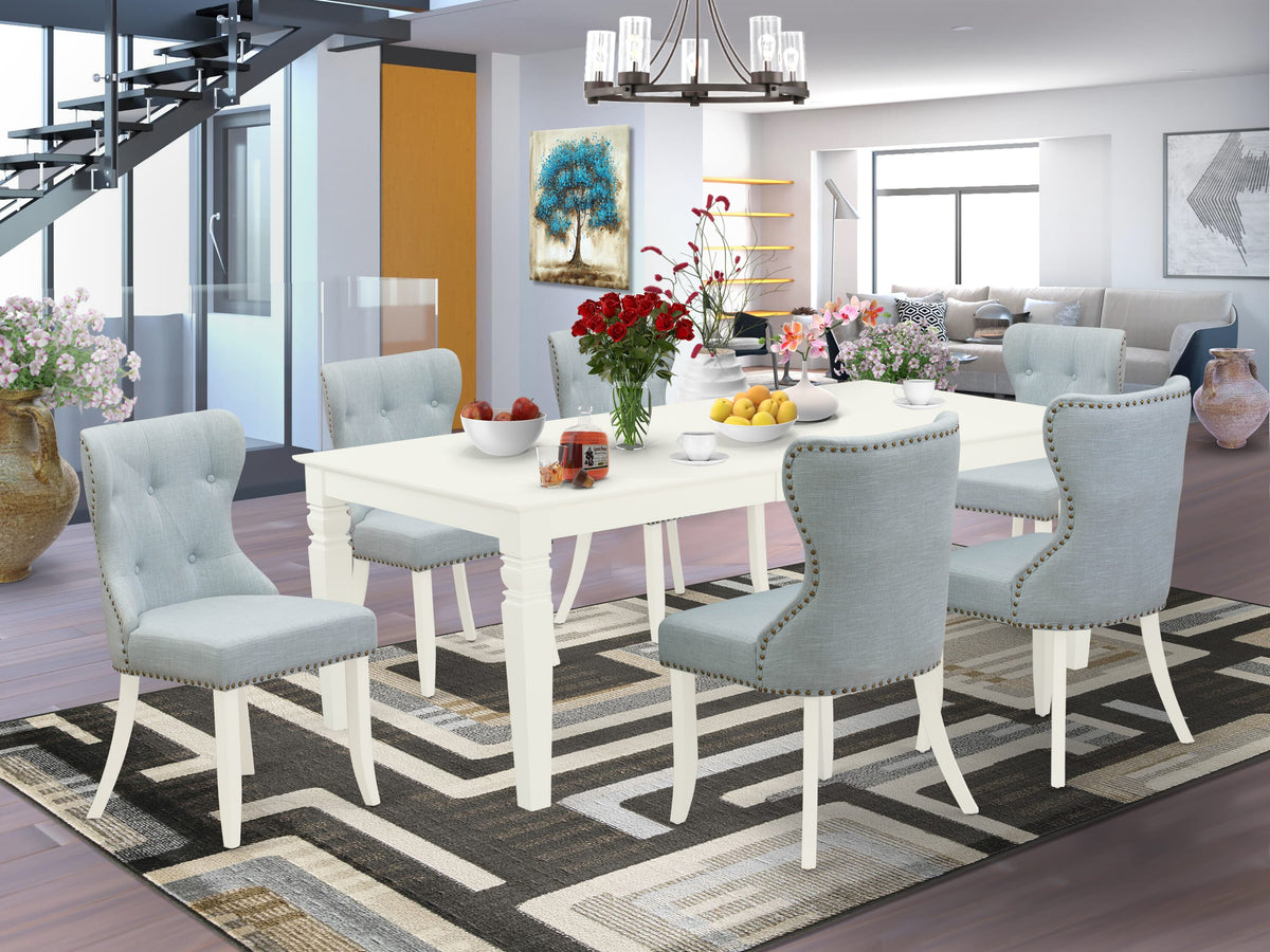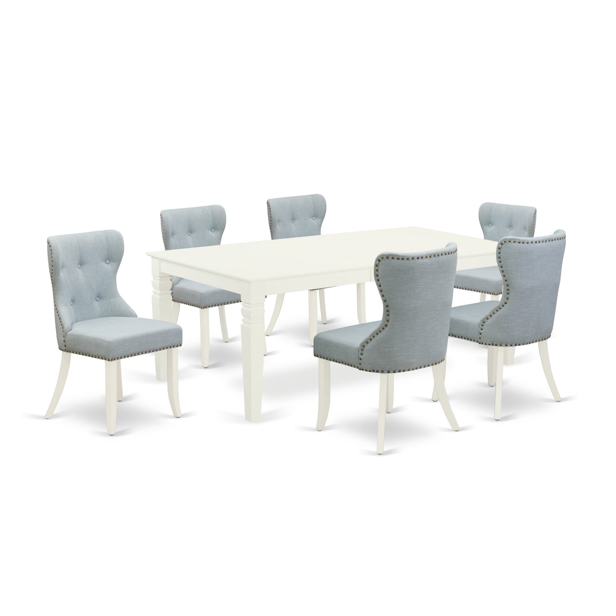 East West Furniture LGSI7-8DY-Z6 of six pieces of parson chairs with Linen Fabric Baby Blue color and a delightful two-side 18 butterfly leaf rectangle wooden dining table with Linen White color