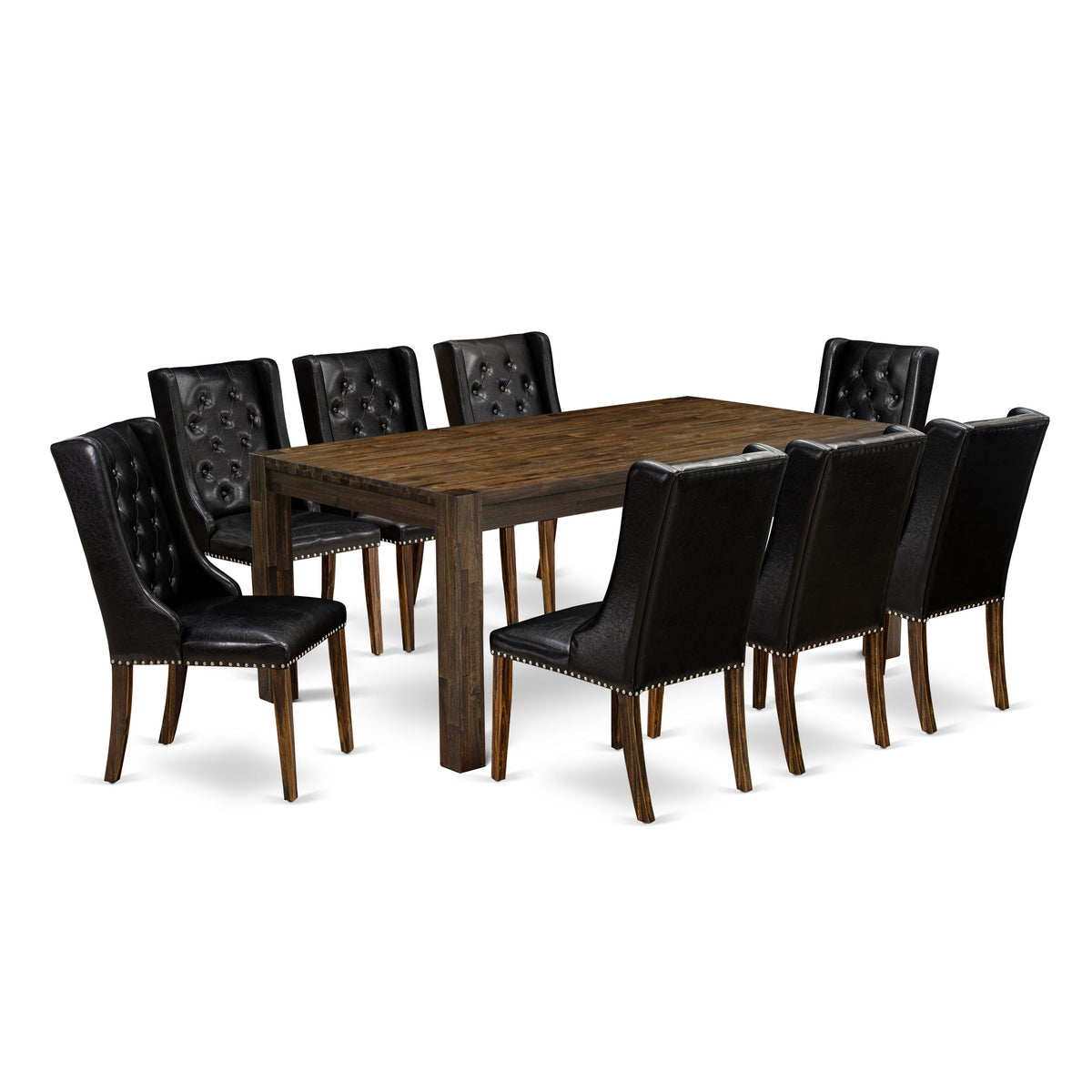 LMFO9-99-B2 Stylish Dining Ensemble - 9-Piece Set with Rustic Table & 8 Chic Black Chairs, Jacobean Finish