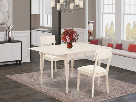 Upgrade your dinette space with this simple yet convenient MZAD3-6M9-33 dinette set. This exclusive dining table set for 2 features an elegant look to improve any sort of kitchen area or residence's kitchen space for any gatherings. The comfortable 3 pieces dining set contains a rectangle table and two dining chairs. The rectangular-shaped hardwood table finished in linen white color is made from top-rated quality rubberwood known as Asian hardwood. The dinette table includes two 9-inch drop down leaves that provides additional space for extra food trays and drinks. The 2 drawers of the dining table provide additional storage to help keep you organized. The easy to assemble dinette table ensures pleasure and long-lasting use. The dining chairs set of 4 will be perfectly designed and adequately harmonizes with the vibrant Linen White surface. This versatile, well-engineered group of dining chairs set of 4 are suitable for special events or everyday household dining. These dining room chairs come with faux leather seats to match preference and ideal motif. The frame of the modern dining chairs is constructed to offer a great amount of comfort to your spine and thus reduce the chances of back pain. The durable faux leather seat does not retain moisture, will last a long time and can usually be wiped clean with a rag and warm water easily. This fashionable, affordable and relaxing dining table set can be a sensible choice if you are looking for a great dining time experience with family and friends.