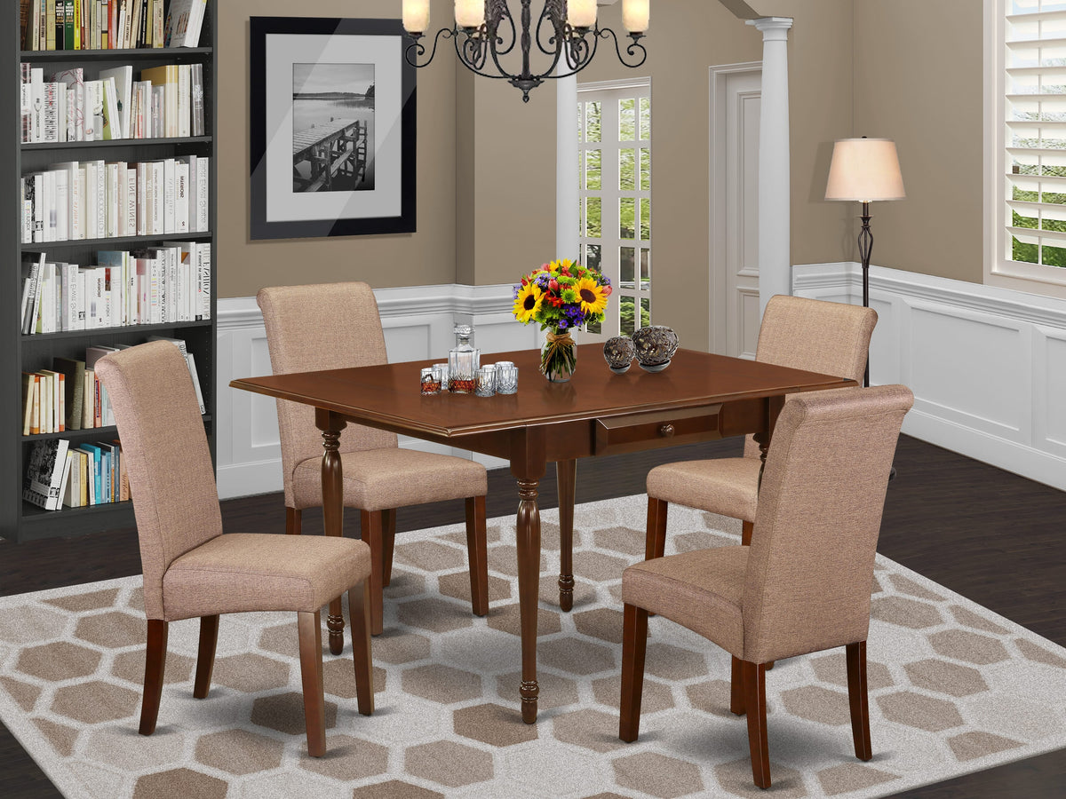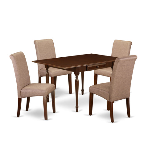 Modernize your kitchen room with this simple yet multi-functional MZBA5-4XU-2W dining set. This distinctive dining table set provides a trendy look to enrich any type of dining room or home's dining area for any events. The useful 5 piece dining table set for 4 contains a dinette table and four parson chairs. Manufactured from Asian tropical hardwood also known as rubberwood, the modern dining table finished in Mahogany has smooth edges and fashioned round legs for a fancy style. The drop leaf table integrates two 9-inch drop down leaves that provides additional space for extra food trays and drinks. The 2 drawers of the dining table amplify storage in the kitchen or dining room to help keep you organized. The drop leaf table can be assembled without any extra tools and aim to last for long. You need a fashionable and cost effective dining room chair to match your kitchen table. The Barry upholstered parsons dining room chairs are a tasteful, well-made seating solution. The parsons dining chair features a beautiful stitched exterior. Tall back, upholstery, rolled back, high-density foam padding, solid hardwood frame construction, and linen upholstery make these parsons chairs comfortable, durable and attractive. Whether you use this chair in your dining area, kitchen, office or basement, it is an easy to assemble and stylish answer to your seating needs. The conventional parson gives these wooden dining chairs a touch of familiar charm, while the linen fabric in Brown color and clean-lined design elevate this dining chair with a modern flair. This contemporary, cost effective, durable and comfortable dining set can be a good choice if you are looking for a great dining time experience with your family or friends.