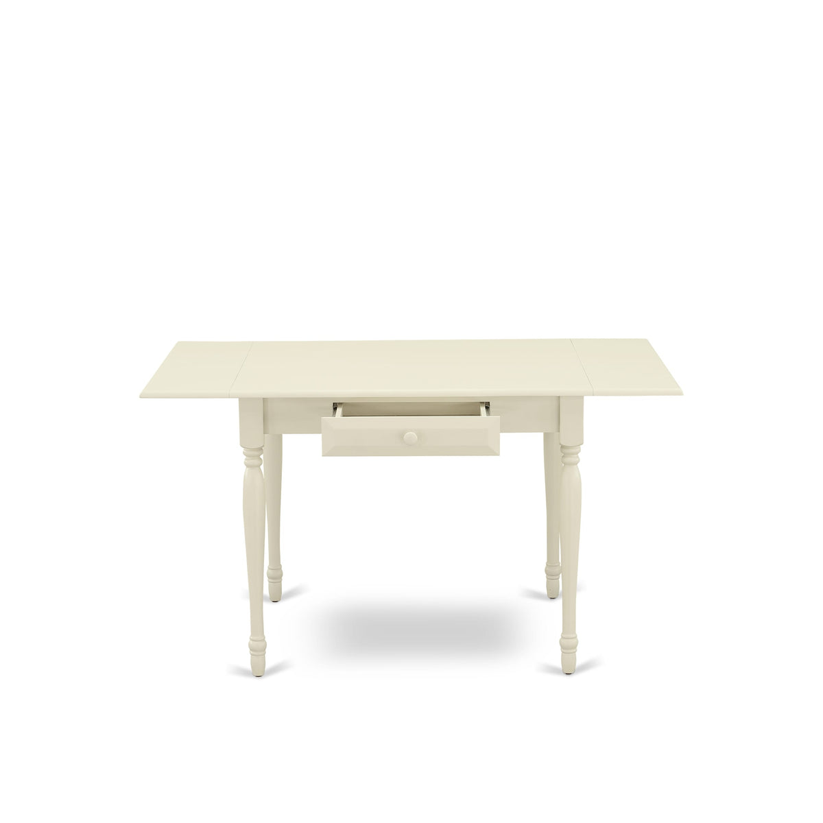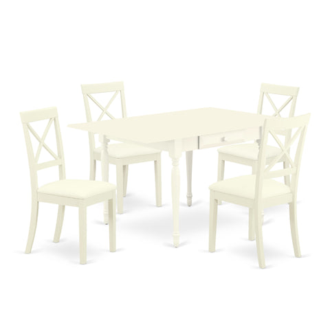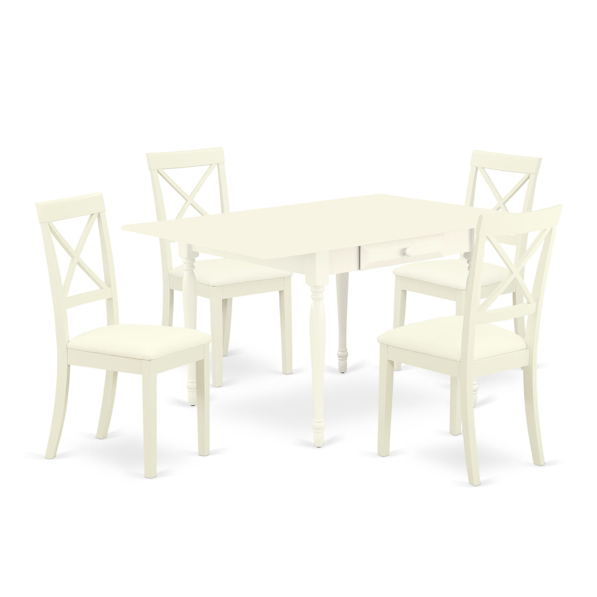 Furnish your kitchen area with this stylish MZBO5-8MV-8T dinette set to achieve an amazing and shiny appearance. These amazing kitchen table sets feature elegant appearance to enrich any kind of kitchen area or residence's dining space for any gatherings. The comfortable 5 piece dining table set contains a small table and four Faux Leather seat chairs. The rectangular-shaped hardwood table finished in Linen White is manufactured from excellent quality rubberwood known as Asian hardwood. The small kitchen table includes two 9-inch drop down leaves that provides additional space for extra food trays and drinks. The 2 drawers of the dining table amplify storage in the kitchen or dining room to help keep you organized. The easy to assemble small kitchen table ensures pleasure and long-lasting use. Slender X back wood dining chairs present trendy and comfy seating, with faux leather seats to match preference and ideal motif. Made up of hardwood, the dining chair is stable and offers a sturdy finish. The dining chair adds elegance and class to any place you have placed them. The frame of the dining room chairs is engineered to offer a great amount of comfort to your spine and thus reduce the chances of back pain. The durable faux leather seat does not retain moisture, will last a long time and can usually be wiped clean with a rag and warm water easily. The matching color of the dining chairs set of 4 with the table brings a good contrast in the kitchen area. This contemporary, budget-friendly, durable and comfortable dining room table set can be a good choice if you are looking for a great dining time experience with family and friends.