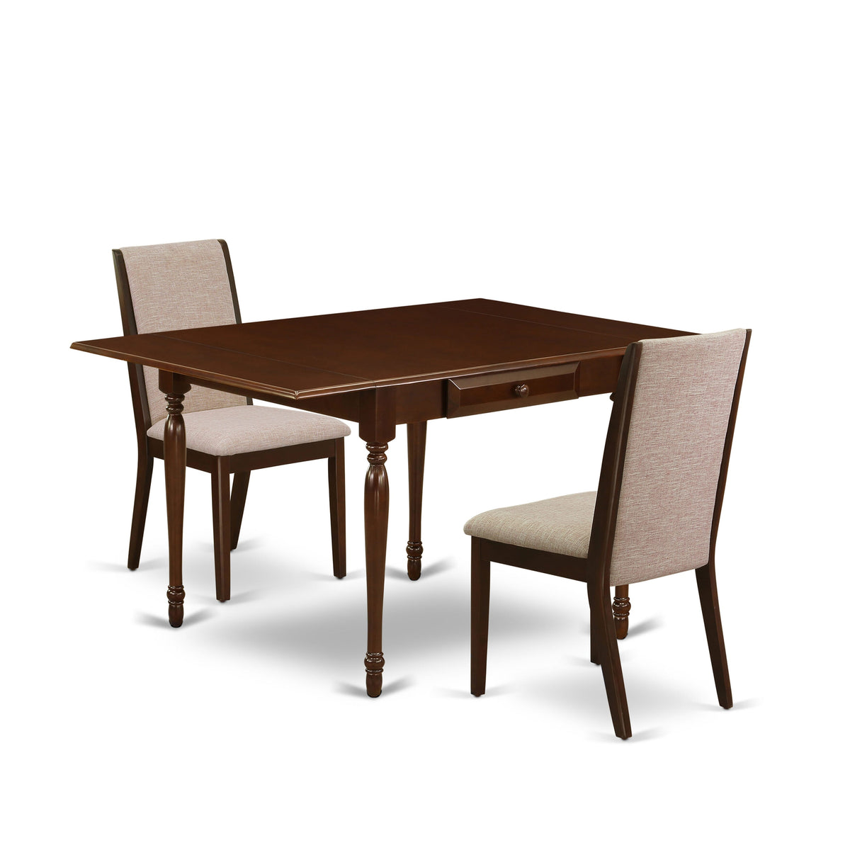 East West Furniture 3-Pc dining kitchen table set including 2 fabric kitchen chairs and a rectangular luxurious drop leaves kitchen table will increase the elegance of your dining room or kitchen areas. This dining room table set is manufactured from strong Asian wood, known as Rubber Wood, which is rugged enough to withstand years of use. It also has an ergonomic design, which is very comfortable. Single rectangular drop leaves kitchen table with 2 padded parson chair is in Mahogany finish. This wood dining table set would add elegance and attractiveness to your kitchen or dining area. This dinner table is flexible and cozy. This rectangular dining table features a compact design suitable for small areas. The parsons dining room chairs seat is made from soft Linen Fabric cushion, with Solid Rubber wood legs and stylish soft Linen Fabric backrest with Asian wood body, soft cushion, and stylish backrest design to make you more cozy. Our dining table set adds some modern elegance to your home. Kitchen chairs and a drop leaves dinner table offer plenty of space for your family or friends. The simplistic and beautiful design is accentuated by a glossy Mahogany finish. You will surely enjoy this wonderful kitchen dining table set. It's easy to construct the parsons chairs and rectangular drop leaves kitchen table with a simple tool. No additional tools are required. Easy-to-follow instructions, tools, and hardware are included. With the help of a damp cloth, you will clean up your dusty easily. Buy our products in full confidence, because your satisfaction is our #1 priority. Feel free to contact us, we are always here for you.